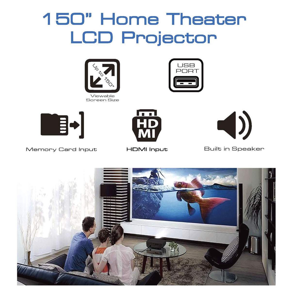 Q: What are the key features of the Naxa 150-inch Home Theater LCD Projector?A: The Naxa 150-inch Home Theater LCD Projector features Bluetooth connectivity for external speaker connection, multiple multimedia functionalities including MHL mobile streaming, USB flash drive and memory card playback, 2 HDMI ports, and AV input. It also includes high-powered speakers, a 3.5mm headphone input for private listening, and a long-lasting LED bulb that provides up to 20,000 hours of usage.