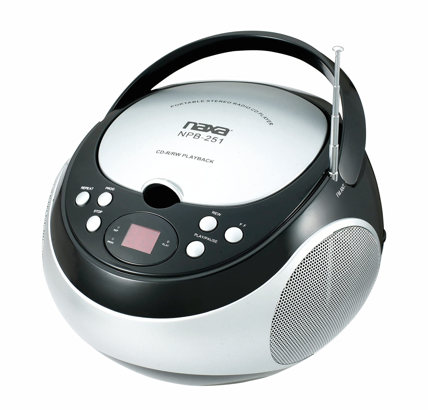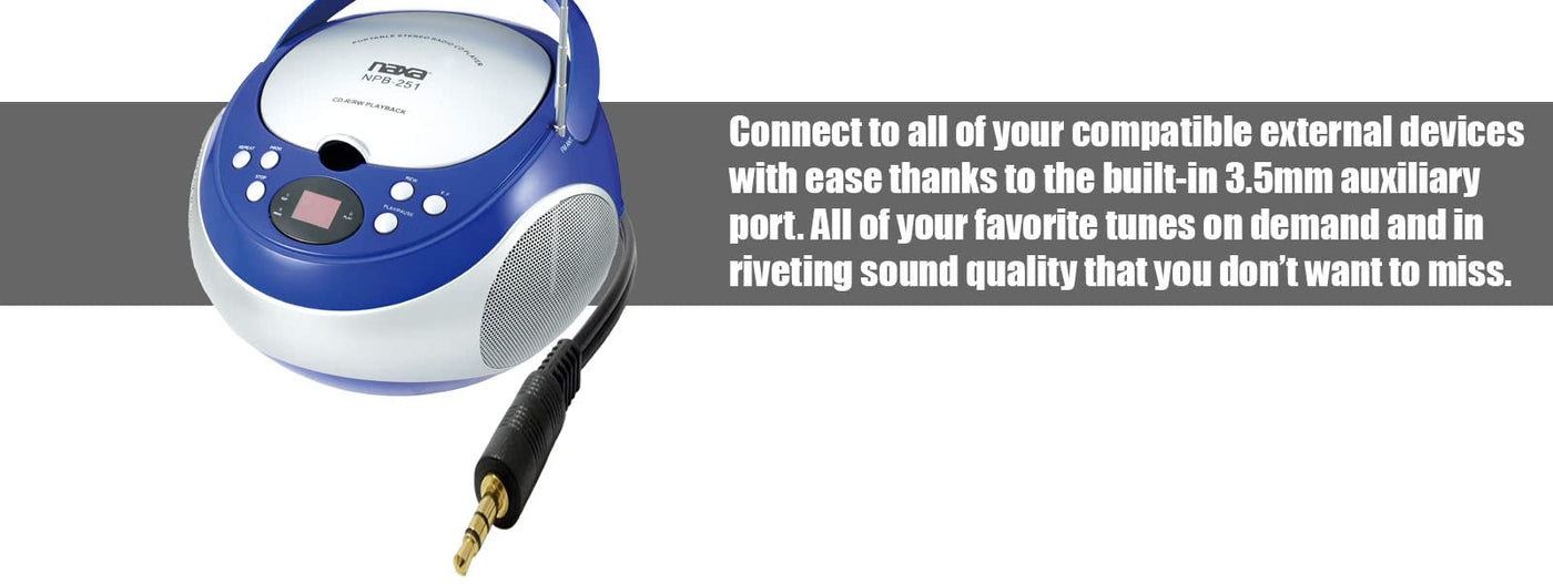The Npb251Bk Portable Cd Player And Amfm Stereo In Black From Naxa Is A Top-Loading Mp3Cd Player With Amfm Stereo Radio, Aux Input, 1619 Track Programmable Memory, Program, Skip, Pause And Repeat Functions, Led Digital Display And Soft-Eject Cd Cover The Telescopic Antenna Ensures Youll Receive All Your Favorite Radio Stations, And Its Miniature Boom Box Design Offers Super Convenient Portability, No Matter Where You Choose To Take Your Tunes