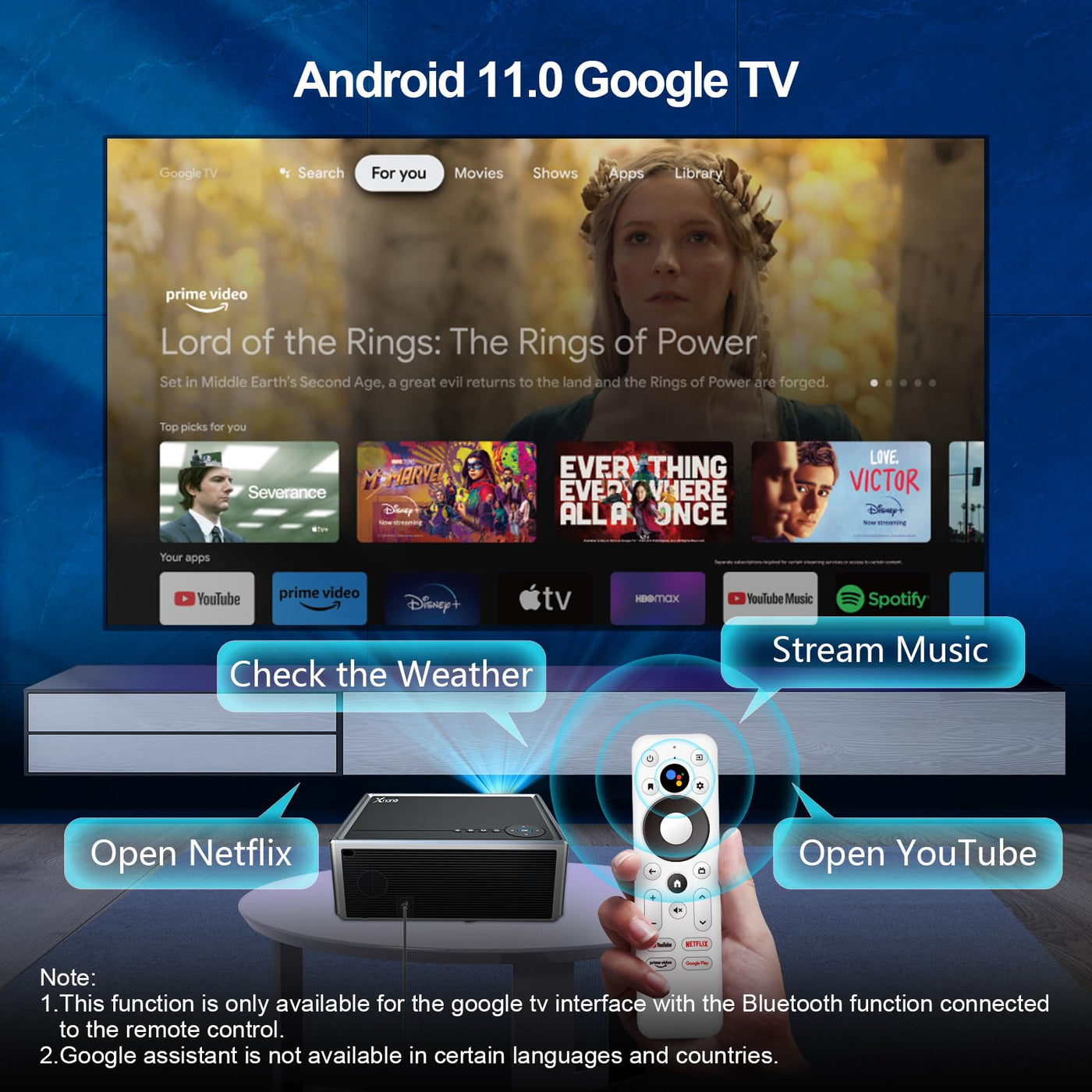 ?Video Smart Projector With Android Os Gtv?: Integrated Smart Gtv System So You Can Access Online Streaming Services And Run App Perfectly For Endless Fun With Services, Such As Netflix, Youtube, Prime Video, Disney+, And More Apps. You Can See 700,000+ Movies And Tv Episodes, All In One Place, No Need To Buy Tv Sticks. Note: Bluetooth And Wifi Functions Are Only Supported In The Gtv System; Therefore, Such As External Chromecast Function Etc. Are Required In The Gtv Ui To Be Able To Use Them.?Auto Focus & Auto Keystone Correction?: This Movie Projector Proyector Adopts Auto Focusing, Making It Easy To Operate. You Just Need To Power It On, And The Projector Will Automatically Adjust The Focus Based On The Focal Length. Within A Few Seconds, You Can Enjoy A High-Definition Picture (Note: The Sensing Distance Between 55In-157In). The Auto Keystone Correction Feature Of The Projector System Is Disabled By Default. If You Want To Enable This Function, You Can Do So In The Settings.?1000 Ansi & Native 1080P & Support 8K/4K Decoding?: The Home Theater Indoor Projector Imported Focusing Technology And High-Quality Glass Lenses. It Has A High-Definition Native 1080P Resolution And Supports 8K/4K Video Decode. With A Screen Brightness Of 1000 Ansi Lumens, It Can Deliver The Desired Viewing Experience Even In Indoor Settings During The Daytime. You Can Enjoy High-Definition And High-Brightness Image Quality. The Projector Uses An Amlogic Chip And Comes With 16Gb Of Storage.?5.0 Bluetooth & Dolby Audio & Voice Assistant?: The Projector Built-In Dual 5W Stereo Speakers, Providing Excellent Sound Effects For Your Home Theater Without The Need For External Speakers. When Entering The Smart Tv , The Remote Control Will Switch To Bluetooth Connection Mode. At This Time, You Can Use The Voice Assistant To Achieve The Desired Results. The Outdoor Projector Is Compatible With Game Boxes, Tv Sticks, Ios, Android, Pcs, Dvd Players, Usb Flash Drives, Laptops, And Phones?5/2.4G Wifi & Built In Chromecast Function?: The 5Ghz Wifi Provides Double The Transmission Speed Compared To 2.4Ghz Wifi, Enabling Smoother And More Stable Content Streaming And Reducing Latency And Buffering Issues. This Greatly Enhances Gaming Experiences And Wireless Screen Cast. With The Built-In Chromecast Function, You Can Cast Your Favorite Entertainment Content From Your Phone, Tablet, Or Laptop To A Large Screen. It Can Also Be Connected To External Devices Through Hdmi/Usb/Av/Audio.