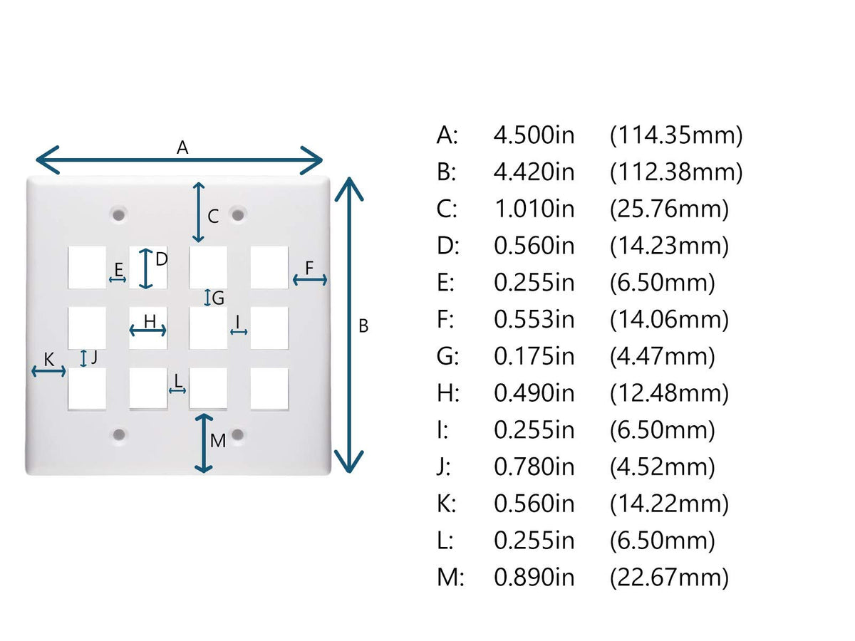 Q: What are the dimensions of the Networx Keystone Wall Plates?A: The Networx Keystone Wall Plates measure 6.75 inches in length and 5.62 inches in width, making them suitable for double gang installations.