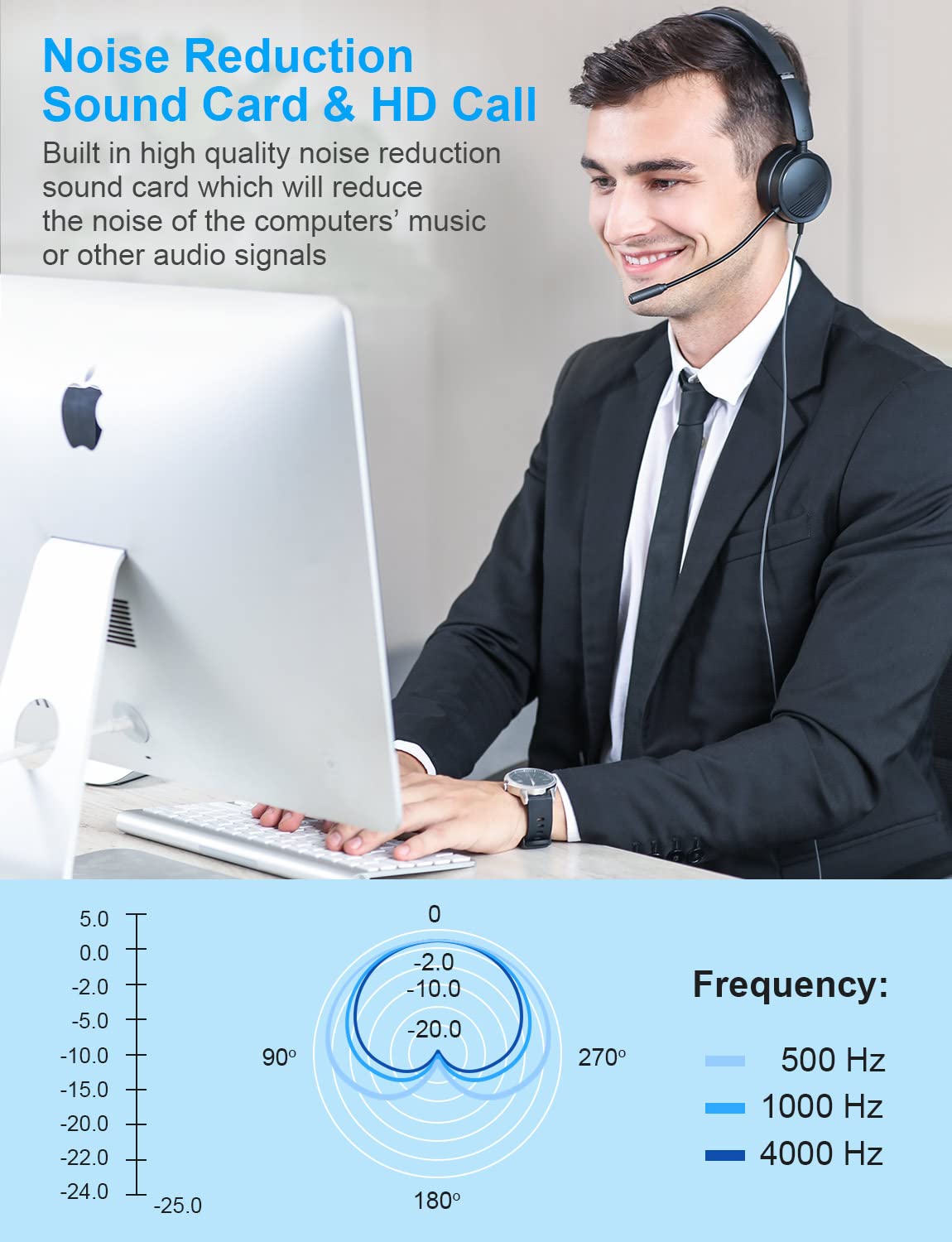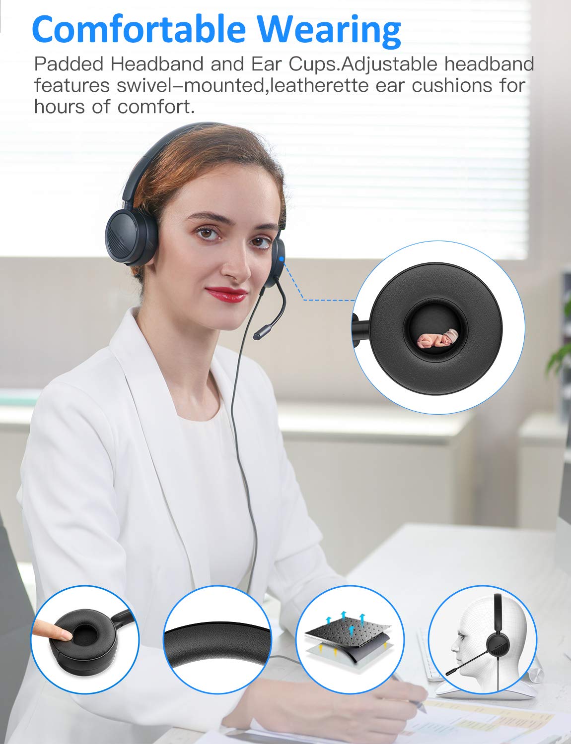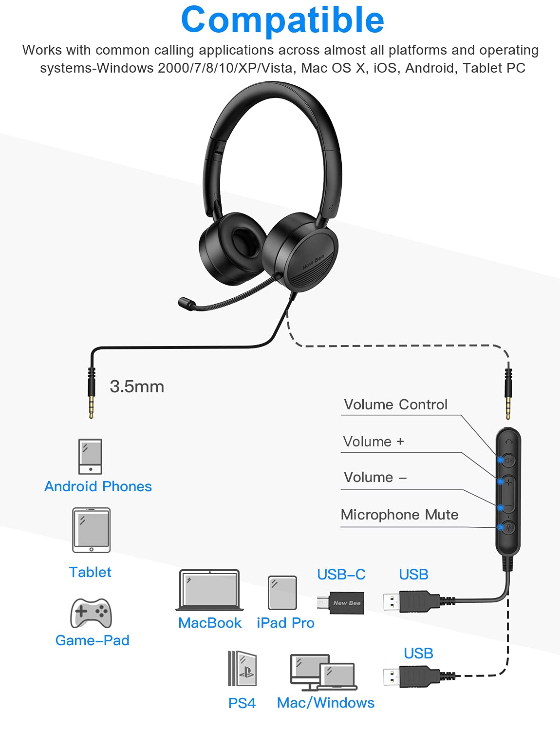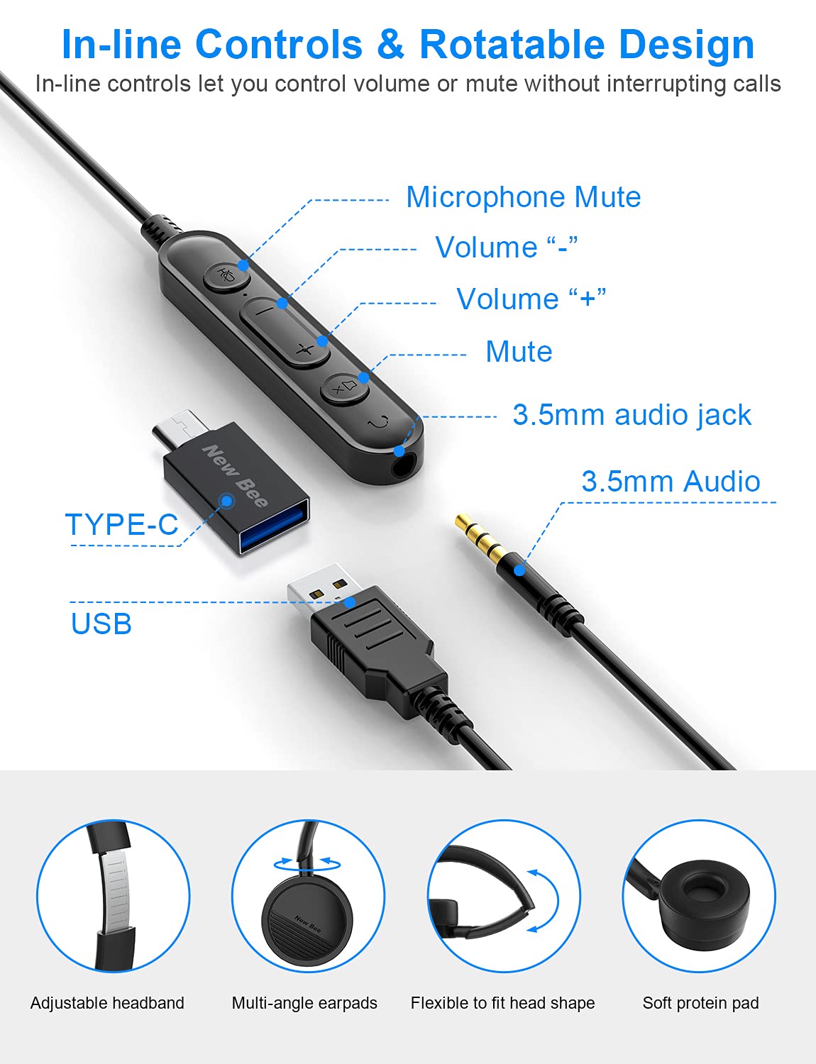 New Bee [2 Pack] Usb Headset Computer Headset In Line Call Controls Office Headset With Noise Cancelling Micphone Call Center Headset For Skype, Zoom, Laptop, Phone, Pc, Tablet, Home