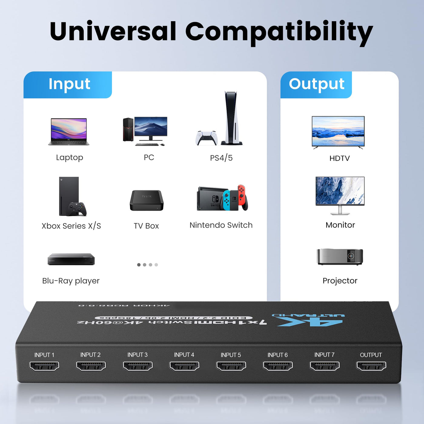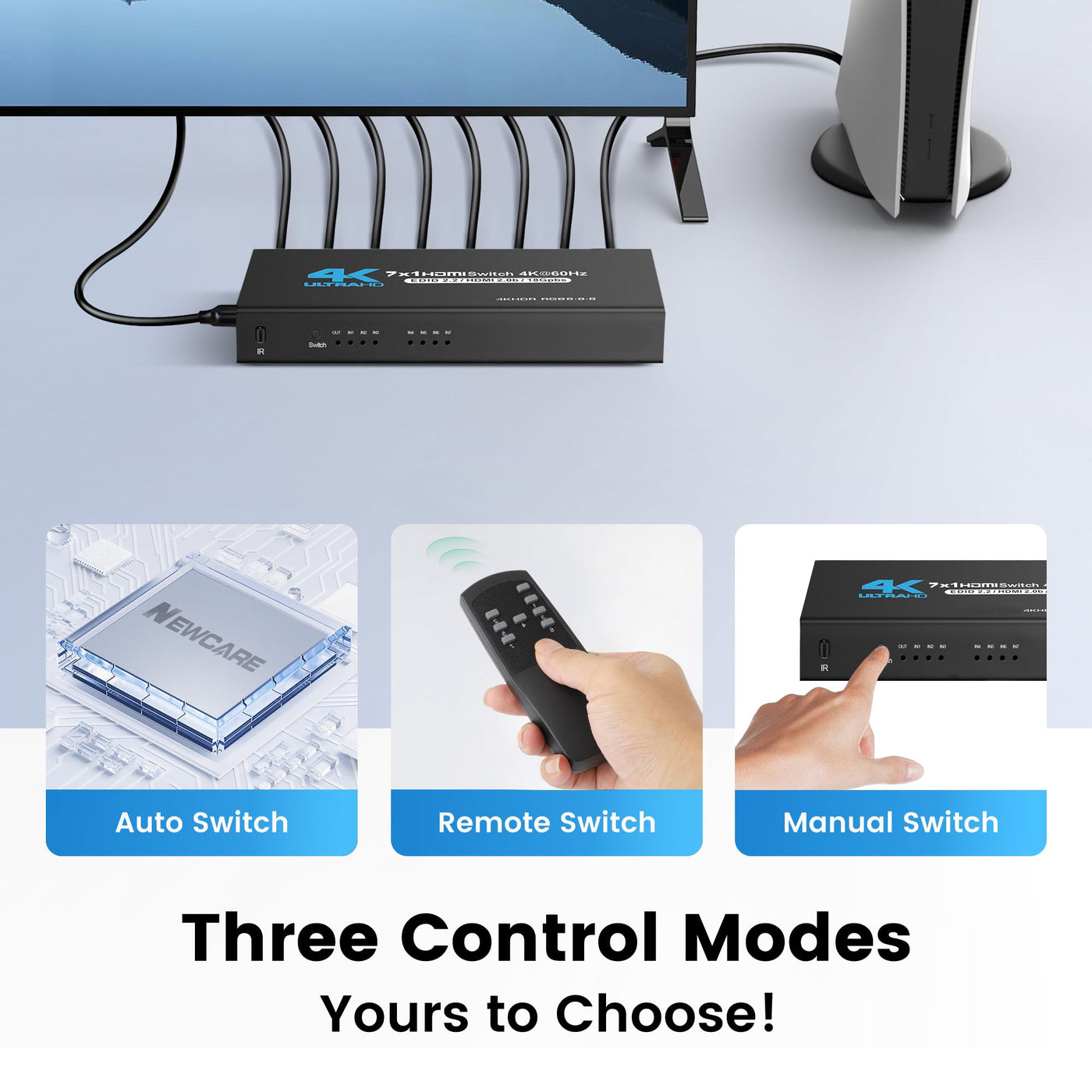 Newcare Hdmi Switch 7 In 1 Out 4K@60Hz, 7X1 Hdmi Switcher With Ir Remote, 7 Port Hdmi Selector Box Support Hdmi2.0, Dolby Vision/Atmos, Hdr10 For Xbox, Switch, Ps5/4, Roku, Fire Stick