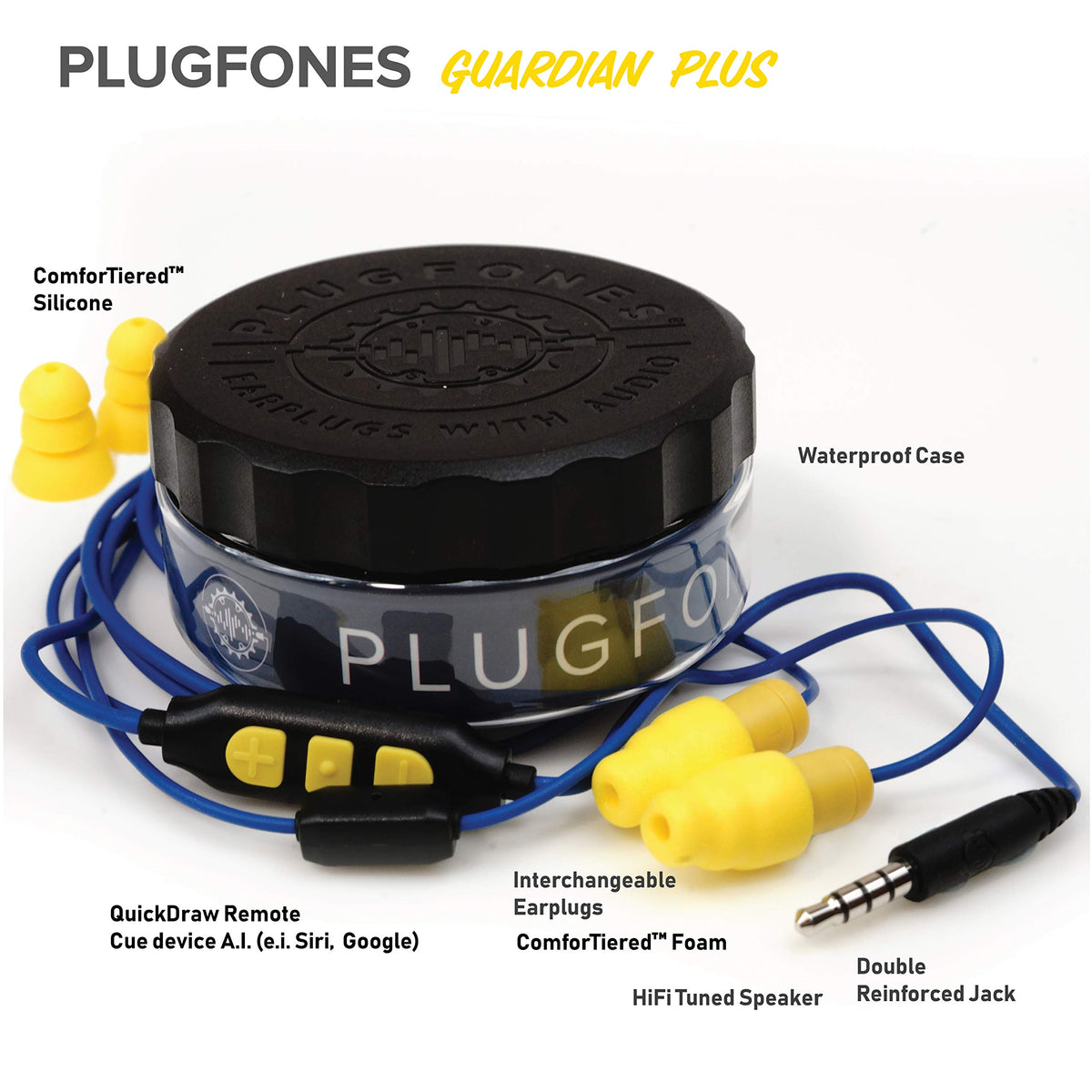 Introducing The Plugfones Guardian Plus--Where Earplugs Meet Earbuds. We Ve Combined Comfortable, Noise-Reducing Earplugs With High-Quality Audio Speakers. The Resulting Hybrid Provides The Ultimate Hearing Protection + Listening Experience On The Market. At Plugfones, We Believe That Work Should Be Enjoyed--So We Created An Earplug-Earbud Product To Help You Do Exactly That. Plugfones Allow You To Hear Outside Low-Level Noises While Listening, So Theyre Great For Any Loud Environment You Find Yourself In--Working Out At The Gym, Diy-Ing In The Workshop, Shooting At The Range, Or Traveling Via Motorcycle Or Plane. The Guardian Plus Has Noise Reduction Ratings (Nrr) Of 23 And 26 Db (Depending On The Plugs Used), Which Protect Your Hearing While Letting You To Listen To Your Music. The Guardian Plus Features The Isotalk Noise Isolating Mic That Helps Reduce Noise When Speaking And The Quickdraw Easy Access Control For Managing Music And Calls. As The Most Unique And Effective Earplug-Earbud Hybrid, Plugfones Are Engineered To Last With A Double-Reinforced Jack And Flexible Wire Casing. With Interchangeable Foam And Silicone Plugs, Tuned Speakers, And Soundseal Noise-Suppressing Technology, They Help You Get In The Zone And Stay There. Because Comfort Is Key, Our Products Are Designed To Fit All Ear Types, Keep You Irritation-Free, And Be Worn For Hours At A Time. Each Set Includes The Guardian Plus Earplug-Earbud Hybrid, One Pair Of Comfortwist Foam Plugs, One Pair Of Comforttiered Silicone Plugs, Waterproof Case, Cable Management Clip, And Quick Start Guide. Wired Plugfones Come Standard With A 90-Day No Hassle Warranty. Plugfones Are Independently Tested And Compliant With Ansi S3.19-1974 Noise Reduction Standards As Certified By Michael & Associates, Inc. And Meet Niosh Criteria. Plugfones Are Not Manufactured By, Endorsed By, Affiliated With, Or Supported By The 3M Company. Choking Hazard: Not Suitable For Children Under The Age Of 3.
