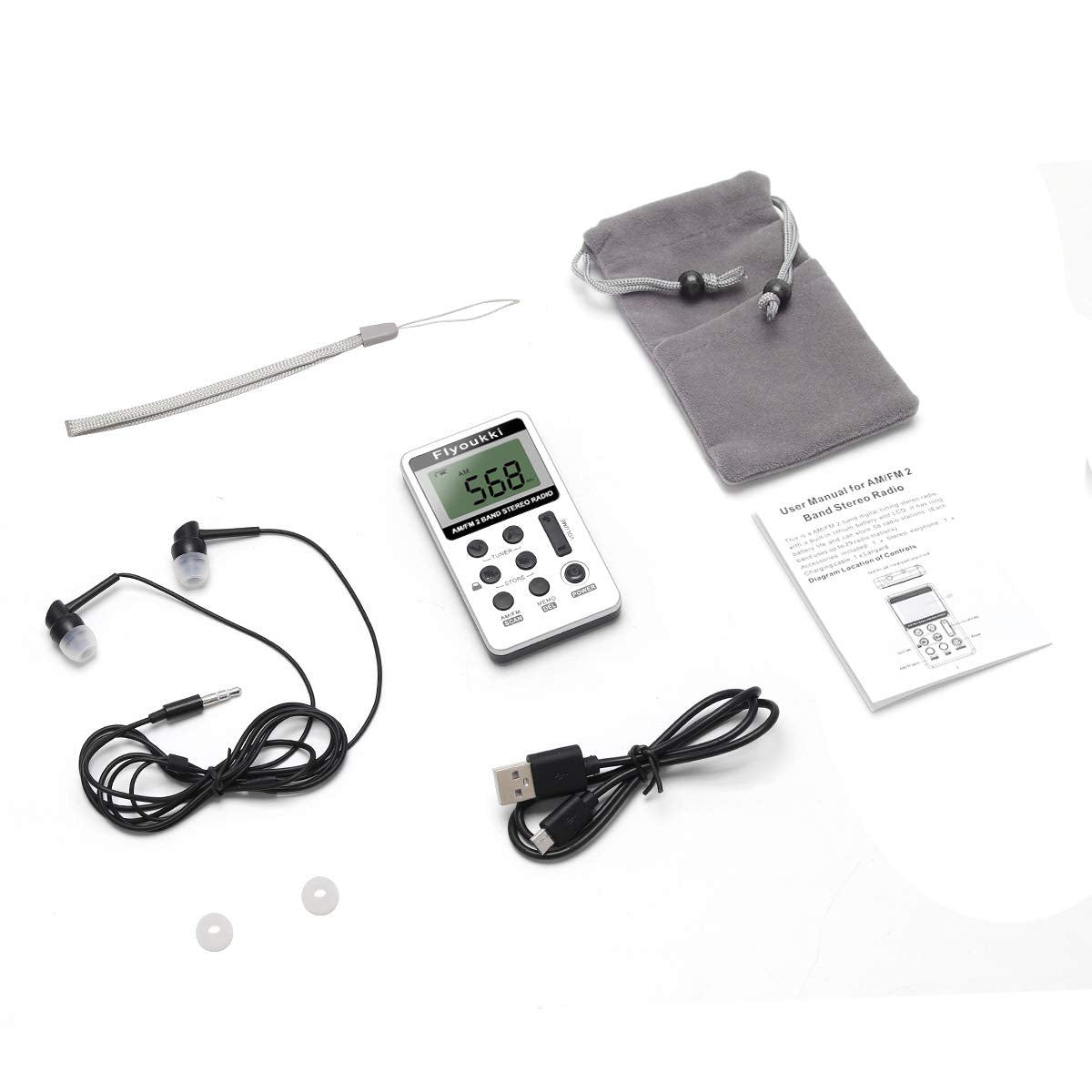 Pocket Small Radio By Flyoukki, Personal Mini Am Fm Portable Digital Tuning Transistor Radios With Best Reception, Earphones, Lanyard And Rechargeable Battery For Walking Jogging Exercising (Silver)
