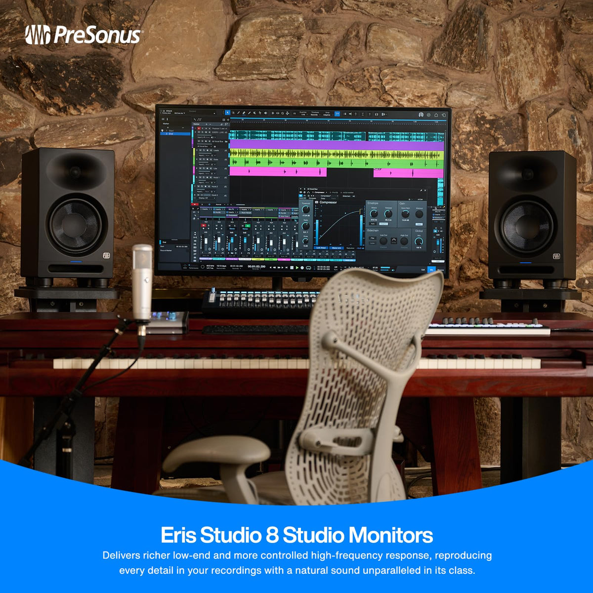 The Presonus Eris Studio 8 Combines Sonic Accuracy With Precision Controls And Flexible Connectivity To Set A New Standard For Studio Monitors. Designed For High-Level Performance In Both Home Studios And Professional Mix Rooms, Its Crystal Clear, Extended Low End And Superior High-Frequency Response Deliver Honest, Articulate Sound In Even The Smallest Of Mixing Spaces. Its Custom-Tuned Ebm Waveguide Provides A Wide, Well-Controlled Sweet Spot With Lifelike Stereo Imaging For Stunning Sonic Accuracy.