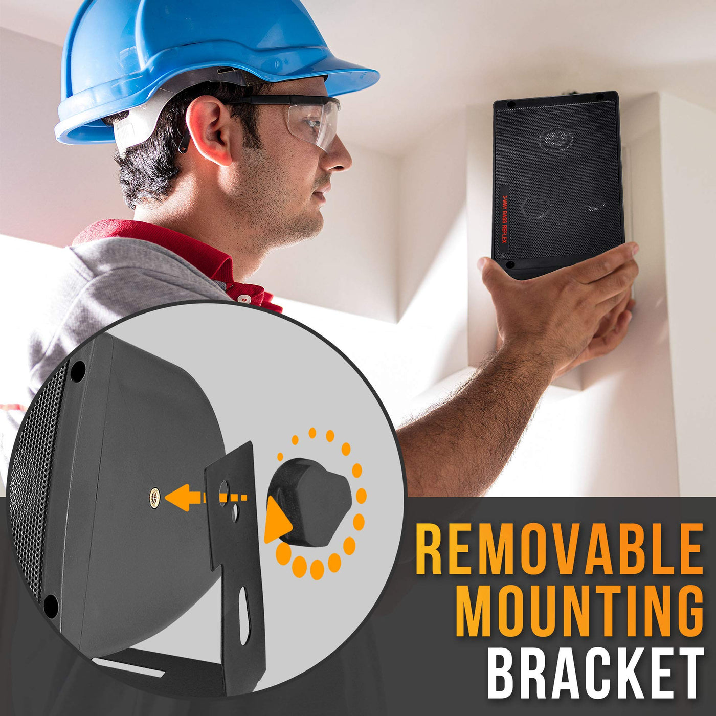 Q: Can these speakers be mounted outdoors?A: Yes, these speakers are designed for outdoor use and come with a complete mounting kit, making it easy to install them on walls, support bars, or frames.