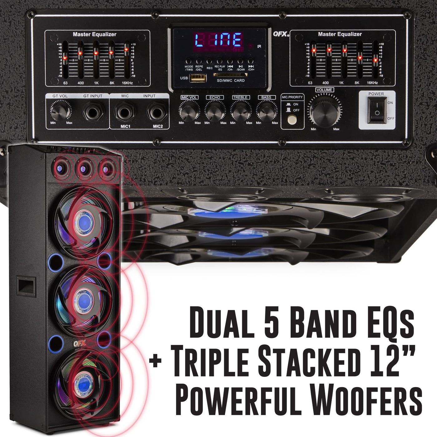 Qfx Sbx 412300Bt Tws Bluetooth Triple 12� Woofer Triple 1� Tweeter Recording High Performance Pa Cabinet Speaker With 10 Band Graphic Eq, 2 Microphone Inputs, Guitar Input, And Aux Input, Blue