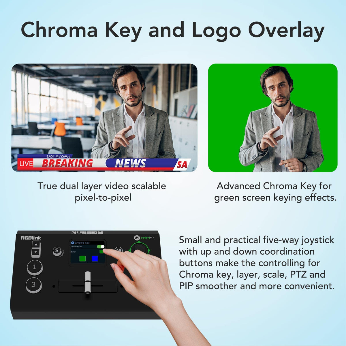 Q: How does the Chroma Key feature work on the RGBlink Mini-pro?A: The Chroma Key feature on the RGBlink Mini-pro allows you to remove a pure color background from your video input and overlay it with another signal. This is perfect for creating a virtual studio effect or enhancing your live stream with engaging backgrounds.