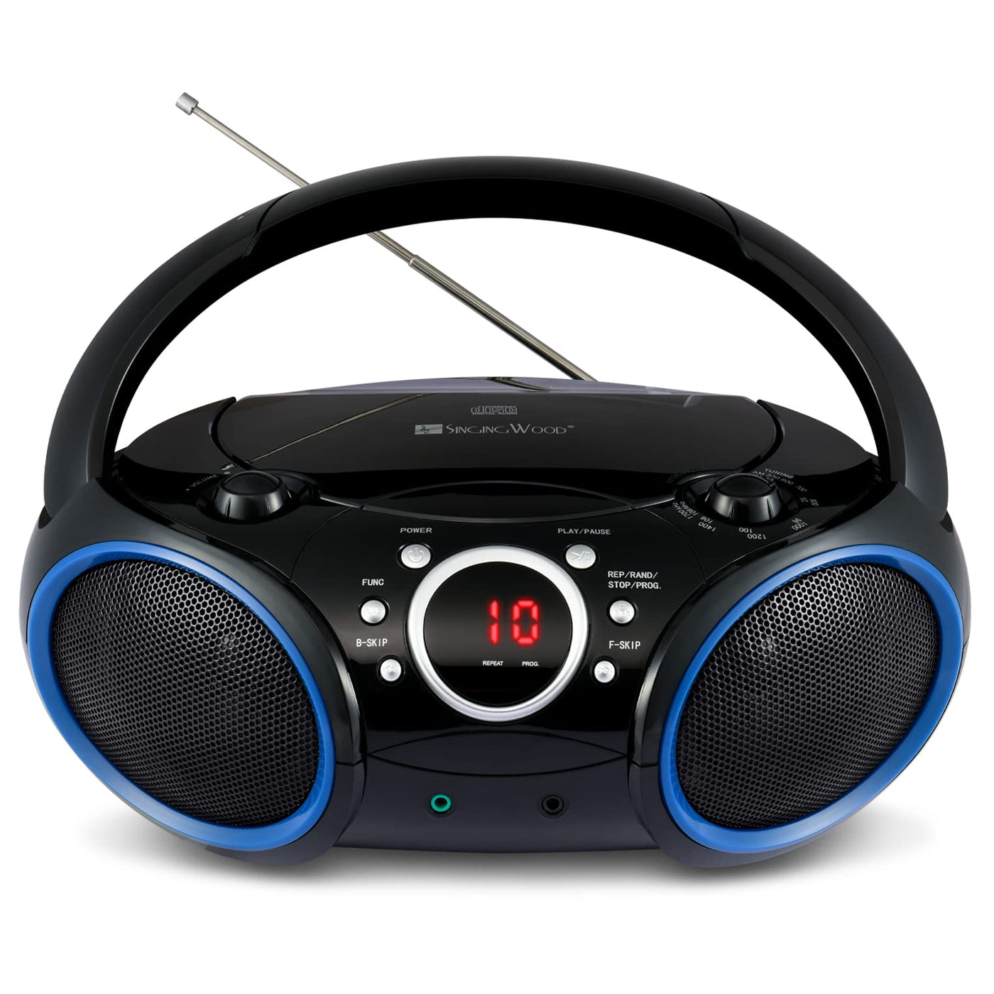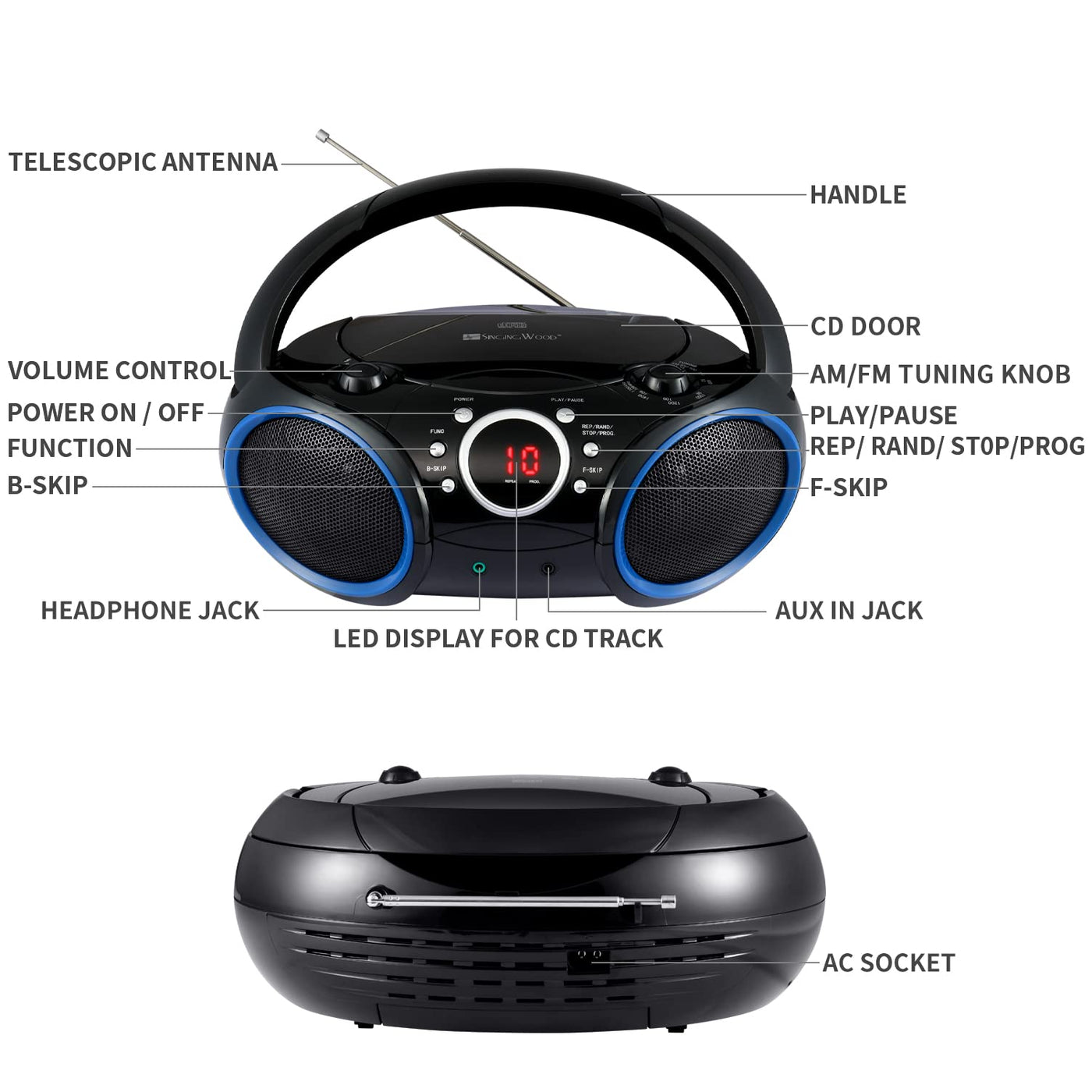 Singing Wood Sbx030C Portable Cd Player Am Fm Radio With 3.5Mm Aux Line In (Aux In Cable Not Included) To Connect With Your Mp3 Player Or Mobile Phone, 3.5Mm Headphone Jack, Foldable Carrying Handle- Ac Or Dc Powered - Black With A Touch Of Blue Rims