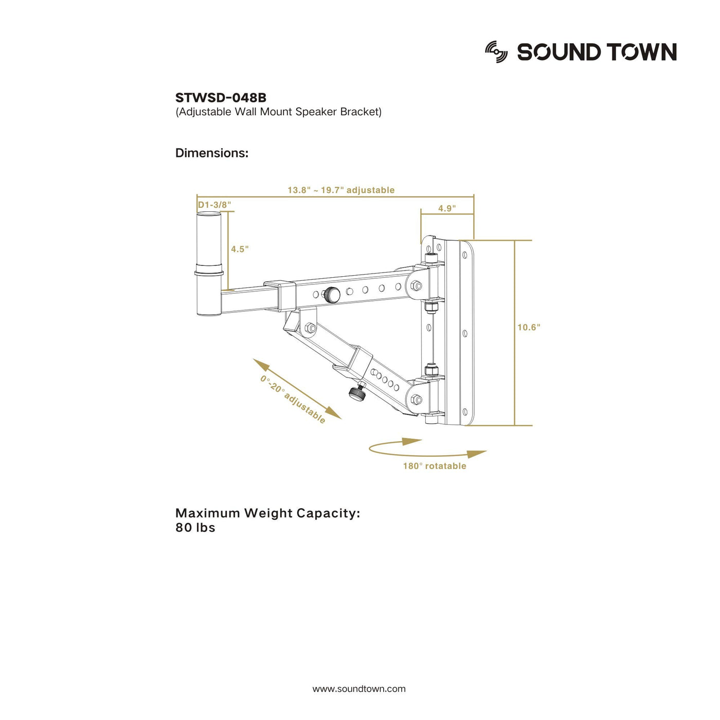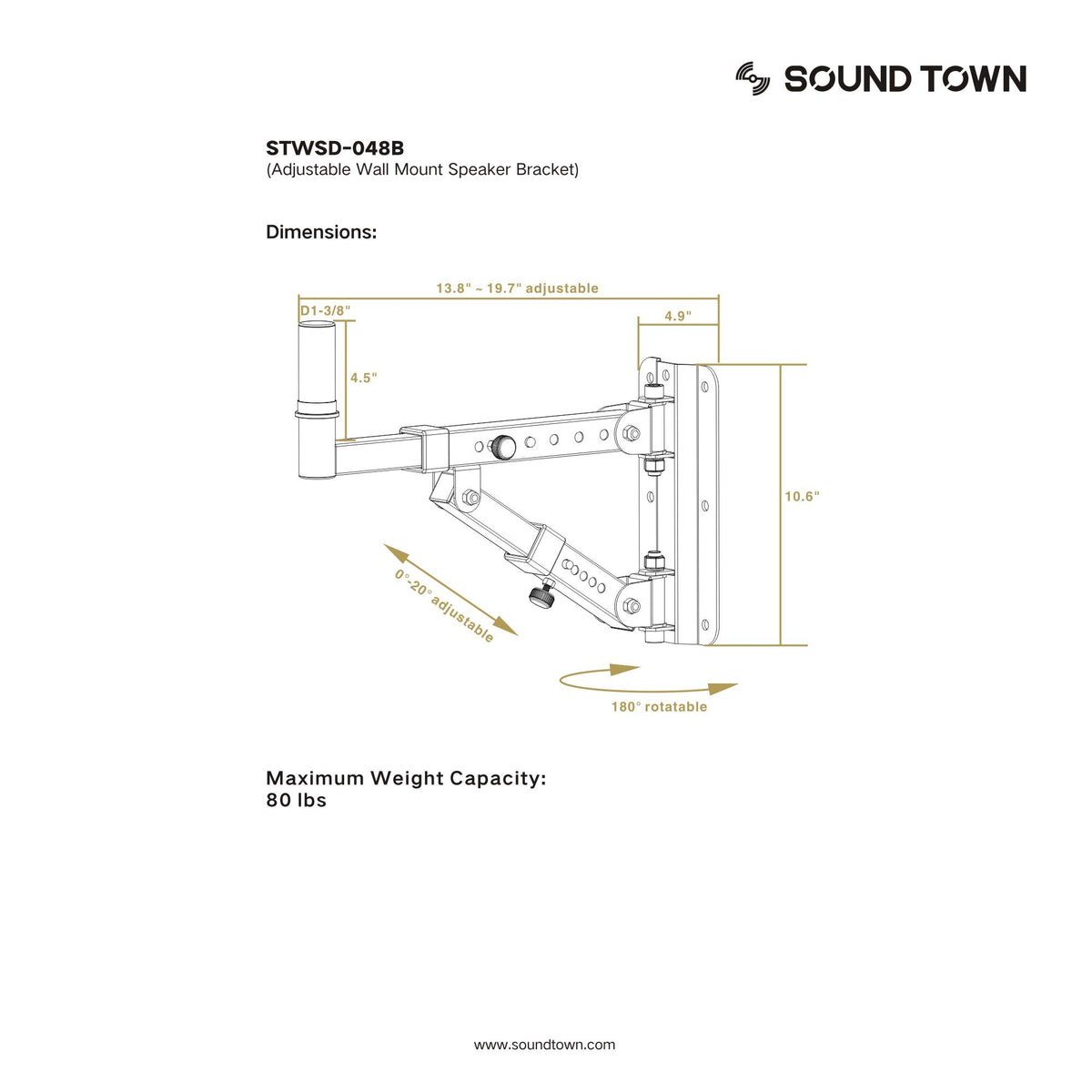 The Sound Town Stwsd-048B Is A 2-Pack Wall Mount Speaker Brackets That Can Safely Hang Speakers On Flat Wall Surface. Each Speaker Bracket Features A 180-Degree Swivel And 0-20-Degree Angle Adjustment Capability And Allows You To Place The Speakers With The Angle You Want For Optimal Coverage. Each Bracket Comes With Heavy-Duty Steel Construction And Up To 80Lbs Maximum Weight Capacity And Provides The Flexibility You Need To Make The Most Of Your System. Features 2-Pack Wall Mount Speaker Brackets Securely Hangs Speakers On Flat Wall Surfaces 180-Degree Swivel And 0-20-Degree Angle Adjustment Each Wall Mount Speaker Stand Supports Up To 80 Lbs Heavy-Duty Steel Construction The� Bracket Hole Diameter Is 9.5Mm And It Is Suggested To Use M8 Screws,Screws Are Not Included. Support