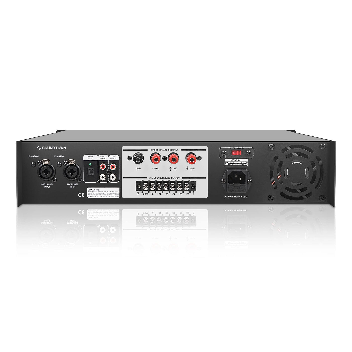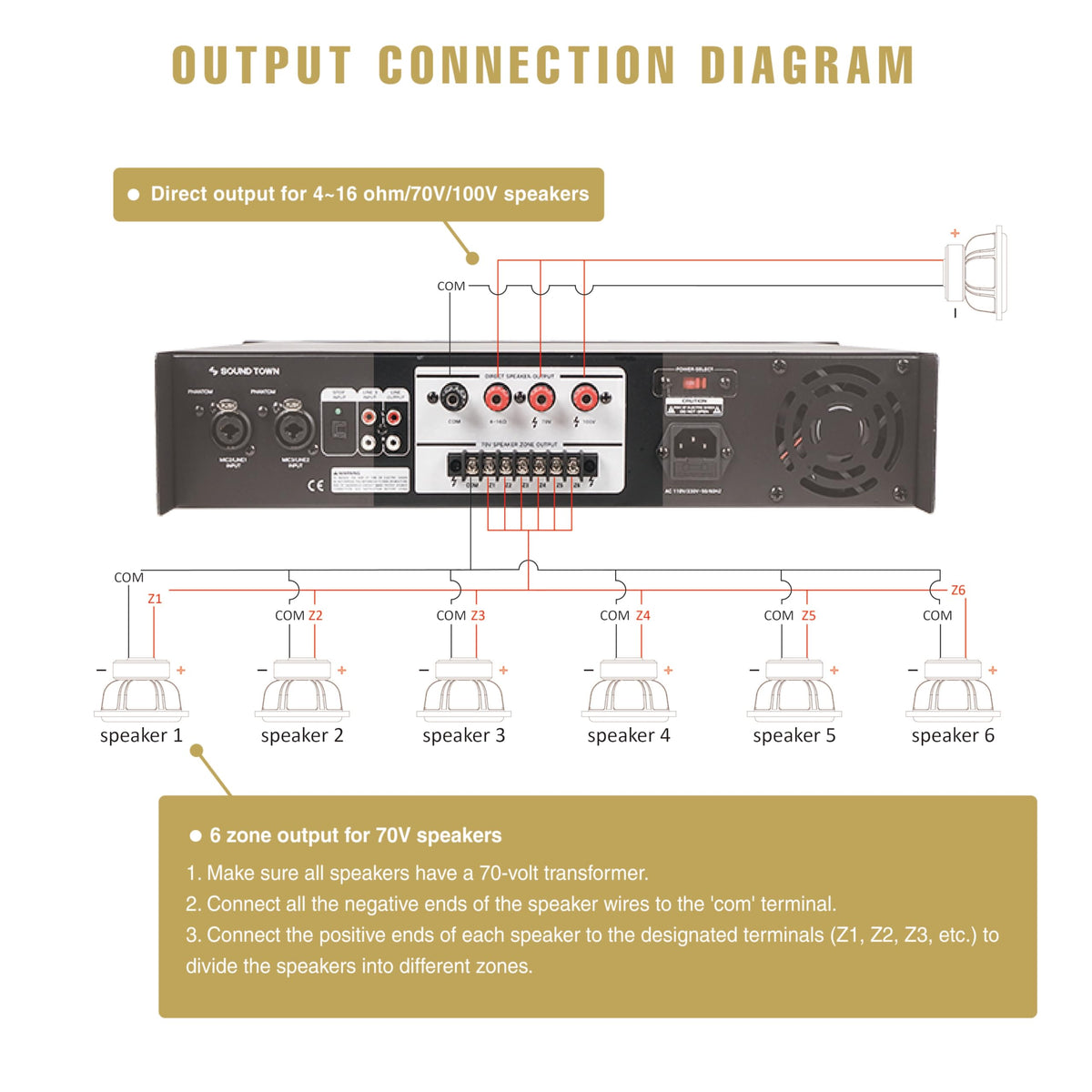 Sound Town 360 Watts 6-Zone 70V/100V Commercial Power Amplifier With Bluetooth, For Restaurants, Lounges, Bars, Pubs, Schools And Warehouses (Stca360-6Z) The Sound Town Stca360-6Z Is A 6-Zone 19� Rack Mountable Commercial Power Amplifier. It Comes With 360W Rms Output And Can Be Split Into 6 Zones. Its Integrated Clipping Limiter Protects Your Speakers And Amp From Overheating. Better Yet, It Is Capable Of 70-Volt, 100-Volt, 8-Ohm, And 4-Ohm And Is Ideal For Applications Such As Restaurants, Bars, Pubs, Schools And Warehouse. The Multi-Zone Power Amplifier Comes With 2 Sets Of Rca Inputs, 3 Mic Inputs, Sd Card And Bluetooth, Usb, Fm Radio And Rca Line Output, 70V / 100V / 4~16-Ohm Red Positive Speaker Output Terminals And Shared Negative Speaker Output Terminal. Its Versatile Input And Output Options Allows You To Easily Set This Up In A Variety Of Multi-Room Applications. Each Of The 3 Mics Input Has Echo Control All 6 Zones Have Separate Volume Knobs For Easy Adjustment. For A Powerful And Budget-Friendly Multi-Zone Commercial Power Amplifier, Check Out The Sound Town Stca360-6Z.