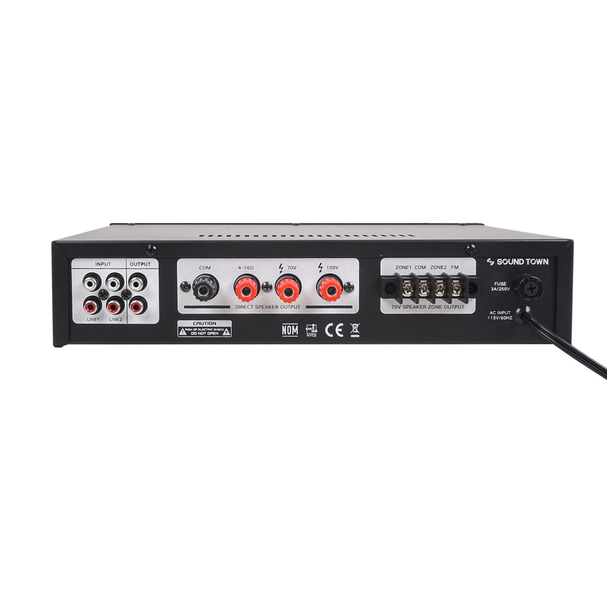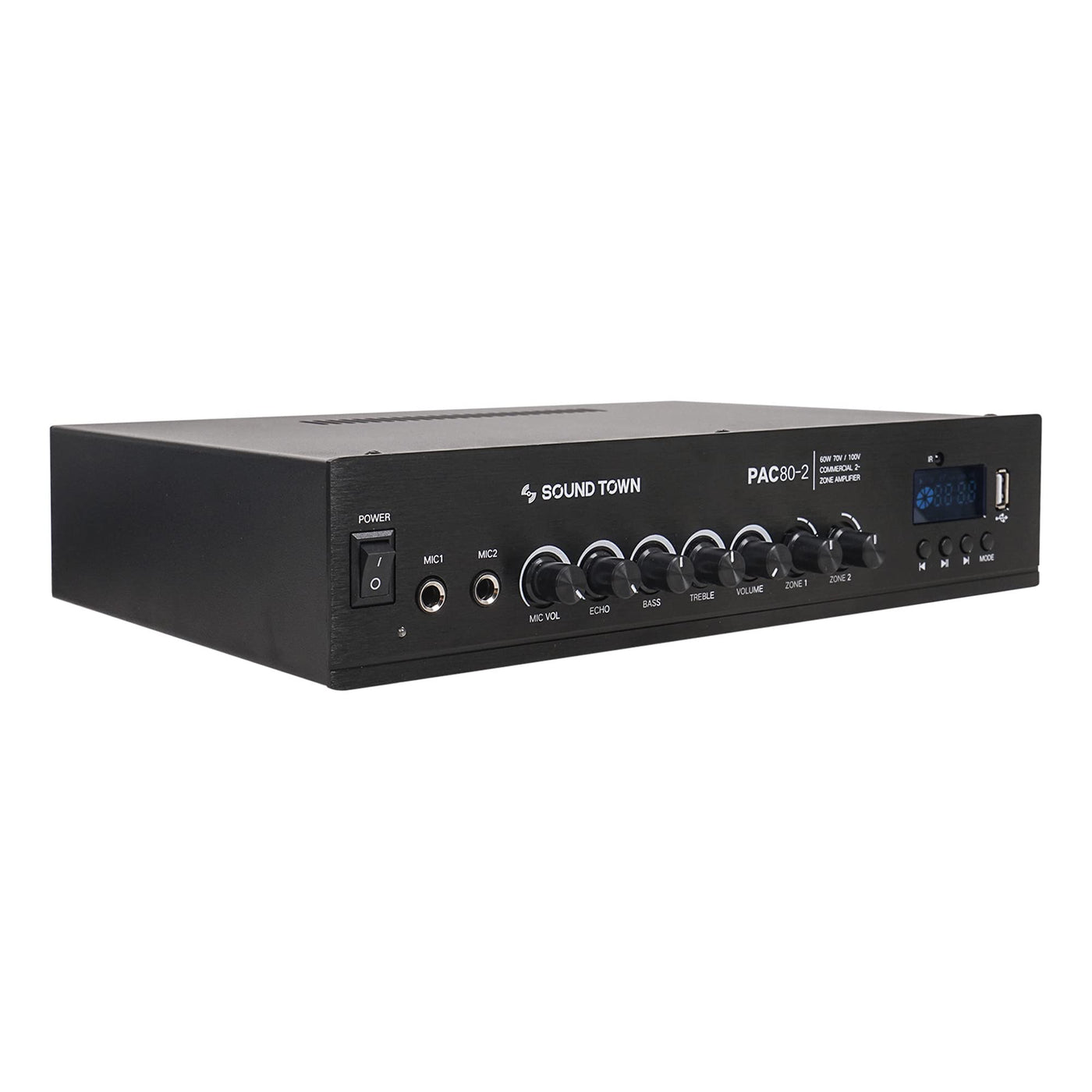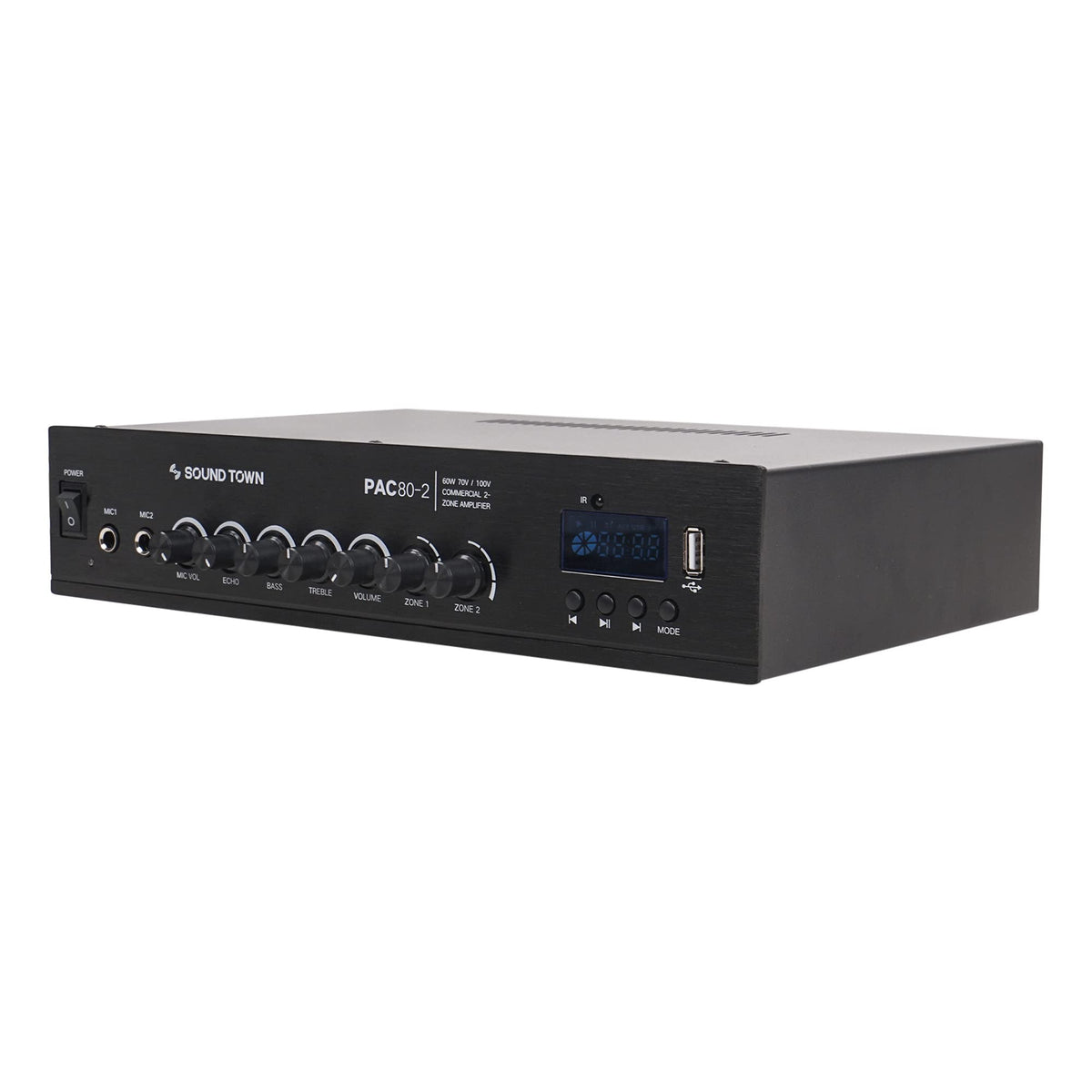 The Sound Town Pac80-2 Is A 2-Zone Compact Size Commercial Power Amplifier. It Comes With 60W Rms Output And Can Be Split Into Two Zones With Individual Controls. Its Integrated Clipping Limiter Protects Your Speakers And Amp From Overheating. Even Better, It Is Capable Of 70-Volt, 100-Volt, 16-Ohm, 8-Ohm, And 4-Ohm And Is Ideal For Applications Such As Restaurants, Bars, Pubs, Schools And Warehouse. The Power Amplifier Comes With Two Sets Of Rca Inputs, Two Mic Inputs, And Bluetooth, Usb, Fm Radio And Rca Line Output, 70V / 100V / 4~16-Ohm Red Positive Speaker Output Terminals And Shared Negative Speaker Output Terminal. Its Versatile Input And Output Options Allows You To Easily Set This Up In A Variety Of Multi-Room Applications. Each Of The Two Mics Input Has Echo Control All Two Zones Have Separate Volume Knobs For Easy Adjustment. Features 2-Zone 70 Volt Speaker Outputs With Individual Controls Works With 70-Volt And 100-Volt (4~16 Ohm) Distributed Audio System Without A Separate Transformer Versatile Inputs With 2 Sets Of Rca Inputs, 2 Mic Inputs, Each Of The 2 Mics Has Echo Control, Usb Input, Fm Radio Tuner And Bluetooth With Led Display Built-In Clipping Limiter Protects Your Speakers And Amp From Overheating. Cast-Aluminum Panel For Enhanced Durability Ideal For Multi-Room Applications Such As Restaurants, Lounges, Bars, Pubs, Schools And Warehouses Specifications Package Weight 8.5 Ibs Package Dimensions 18.7' X 11.0' X 6.0' (Inches) � Downloads Pac80-2 User Manual