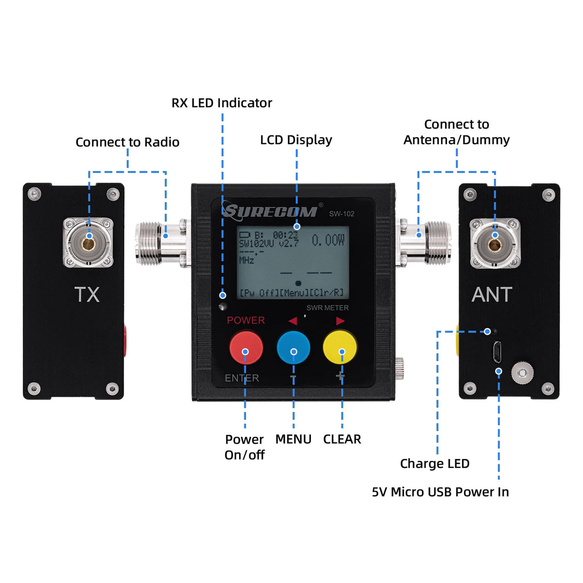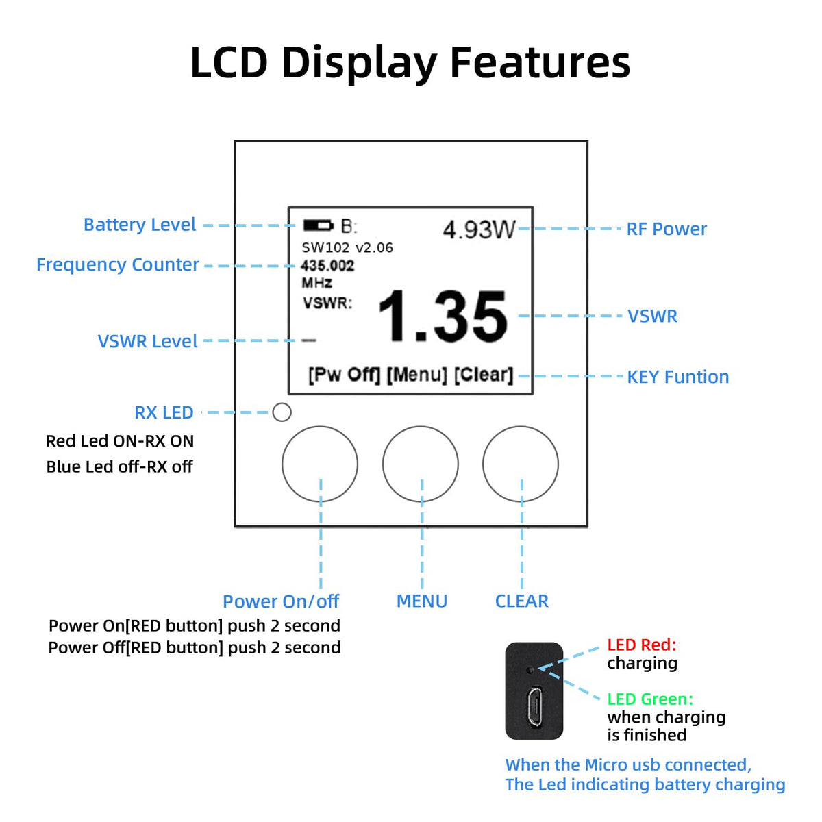 Model: Sw-102S Features: 1 Vswr. Forward And Reflected Power Direct Digital Readout, Without Any Calibration. 2. Maximum Measurable Power Range Up To 120W. 3 Low Insertion Loss (0.3 Decibels Or Less) Structure Allows It To Be Permanently Connected. 4.Build In Frequency Country. 5. All Funtion Display ( Frequency,Power , Swr,Fw,Rw,Battery Level)