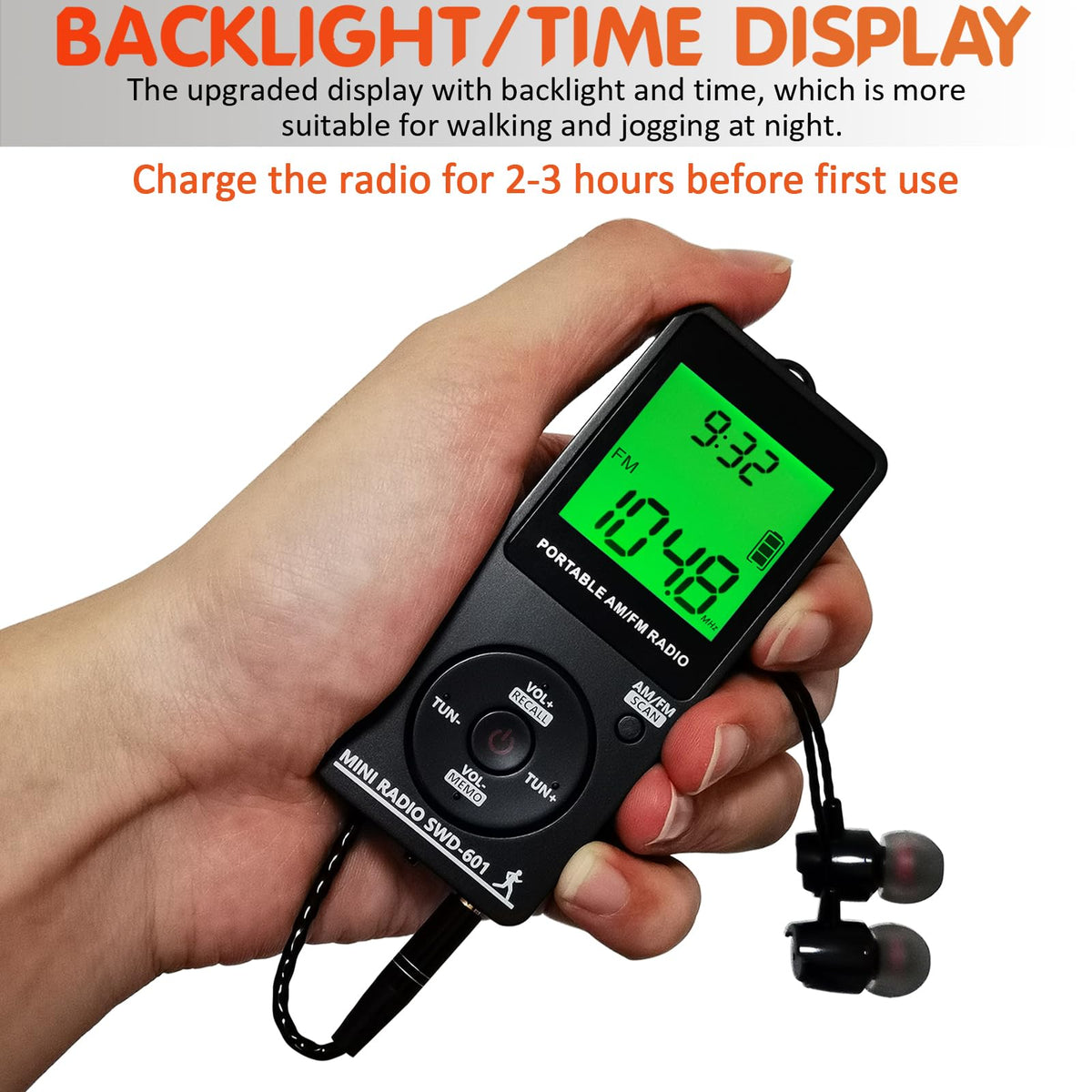 Features:Built-In Excellent Dsp Digital Signal Processing Chip, Support Am / Fm 2 Band, The Received Signal Is More Stable.Compact Pocket Design, Built-In Removable Clip, Light And Easier To Carry.Automatically Or Manually Search And Store The Radio Station.It Can Store 70 Radio Stations, Fm Band Supports Up To 50 Radio Stations Preset, Am Band Supports Up To 20 Radio Stations Preset.Push The 'Lock' Key To Lock All Keys To Prevent Accidental Operation.Built-In Rechargeable Battery, Fully Charged Can Work Continuously For 10 Hours.Unique Green Backlight And Time Display Design, Which Makes It More Easy For You To Use It At Night.The 10-90 Minutes Timing Shutdown, You Can Listen To Radio Programs As You Like Before Going To Bed.Specifications:Frequency: Fm 60-108 Mhz; Am: 520-1710 Khzfm Antenna: Earphone Wire Antennaam Antenna: Internal Am Ferrite Bar Antennaradio Sensitivity: Fm≪8Uv; Am≪20Mv/Mpower: Built-In 3.7V 400Mah Rechargeable Lithium Batterycharging Voltage: Dc 5Vcolor: Blacksize: 3.5 X 1.5 X 0.3Inweight: 1.52Ozpackage List:1 Swdstp Am/Fm Portable Radio1 Stereo Earphone1 Removable Back Clip1 Earphone Cable Clip1 Charging Cable1 Lanyard1 User Manual