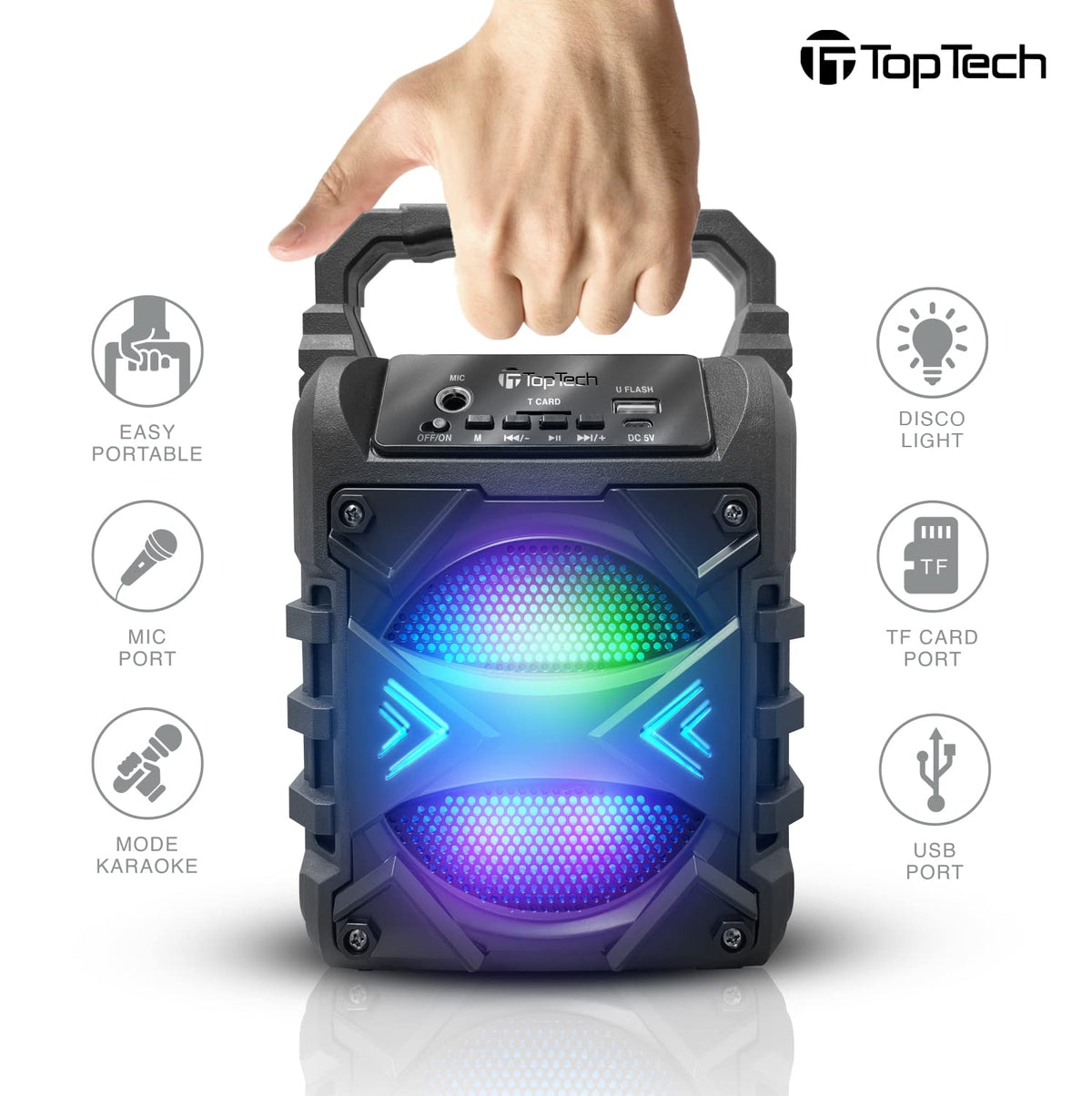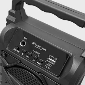 Elevate Your Entertainment Experience With The Top Tech Audio Jet-4 Bluetooth Portable Speaker, A Perfect Blend Of Convenience, Versatility, And Style. Designed For Both Indoor And Outdoor Use, The Jet-4 Features Seamless Bluetooth Connectivity For Wireless Pairing With Smartphones, Tablets, And More. Its 3.5Mm Aux Input Ensures Compatibility With Non-Bluetooth Devices Like Mp3 And Mp4 Players, While Tf/Usb Input Expands Your Audio Options Even Further. Bring Vibrant Energy To Any Event With The Jet-4�S Karaoke Mode, Complete With Dazzling Light Effects That Set The Stage For Unforgettable Gatherings. Easily Toggle Between Accompaniment And Vocal Modes With The Touch Of A Button, And Use A Wired Microphone (Not Included) For Singing Or Speaking. The Intuitive Multi-Function Control Console Allows You To Adjust Sound And Mic Effects, Switch Modes, And More, All In Real-Time. Take Your Party To The Next Level With Tws (True Wireless Stereo) Functionality�Pair Two Jet-4 Speakers To Create A Powerful Stereo Experience That Fills The Room With Dynamic, Quality Sound. Powered By A Rechargeable Dc 5V Battery, This Speaker Delivers Up To 6 Hours Of Continuous Playback, Ensuring Your Celebrations Last All Night. Compact Yet Powerful, The Jet-4 Is Built For Portability And Designed To Impress With Its Sleek Black Finish And Lightweight Construction. Whether You'Re Hosting A Karaoke Night, Enjoying A Backyard Bbq, Or Streaming Music From Your Favorite Device, The Top Tech Audio Jet-4 Bluetooth Portable Speaker Offers Endless Possibilities For Fun And Entertainment.