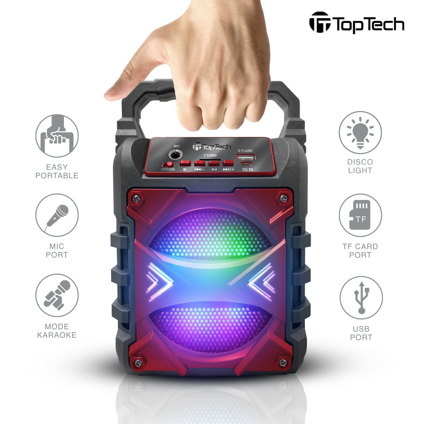 Top Tech Jet 4 Portable Bluetooth Speaker, 400W Power, 4 Inch Woofer, Rich Bass, 6 Hour Playtime, Disco Lights, Karaoke Mode, Tws Function, 100 Ft Wireless Range, Usb, Tf Card & Microphone Input, Red