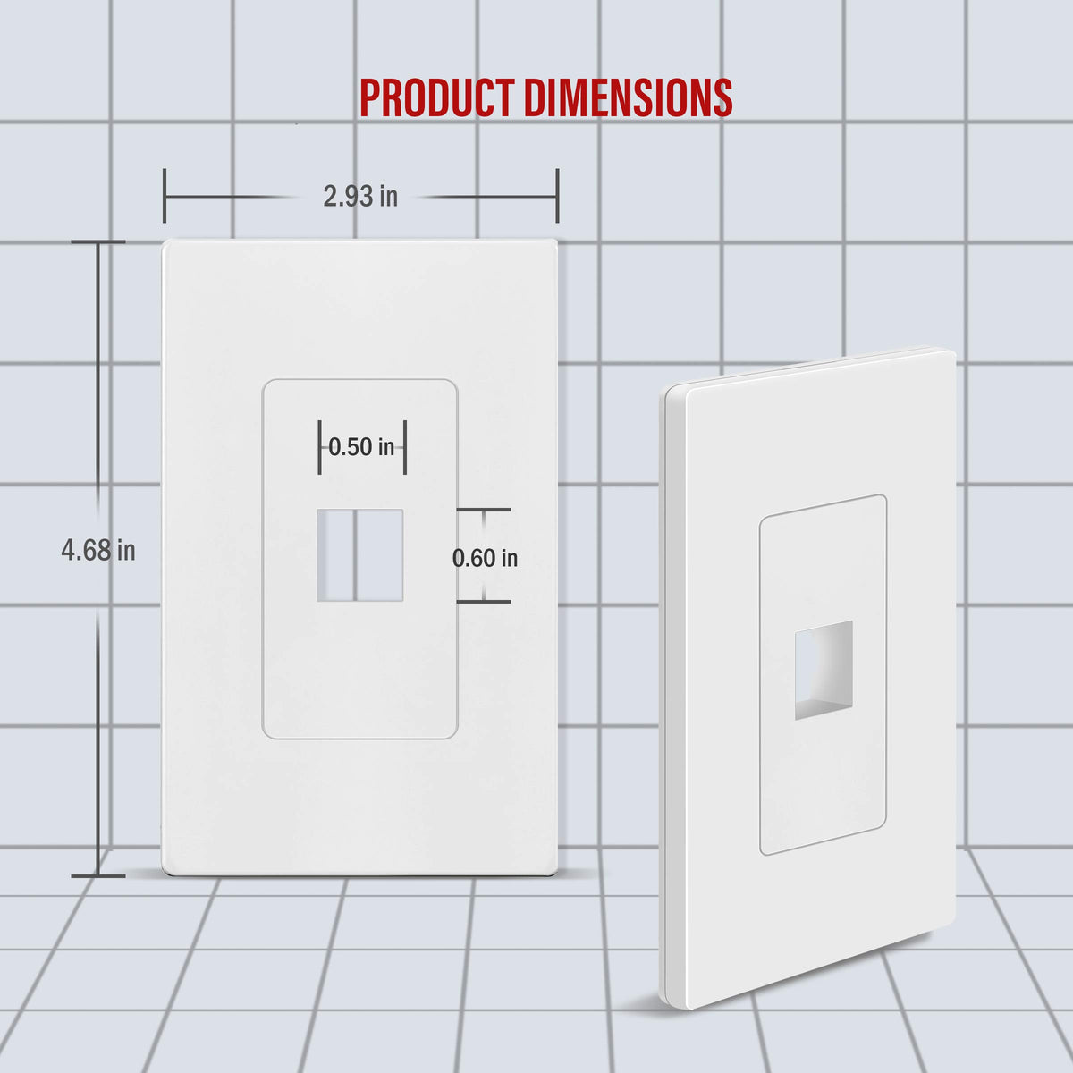 Q: What is the size of the TOPGREENER Keystone Wall Plate?A: The dimensions of the TOPGREENER Keystone Wall Plate are 4.69 inches in height and 2.93 inches in length, with a keystone port size of 0.60 inches by 0.50 inches, designed to fit a standard 1-gang wall box.