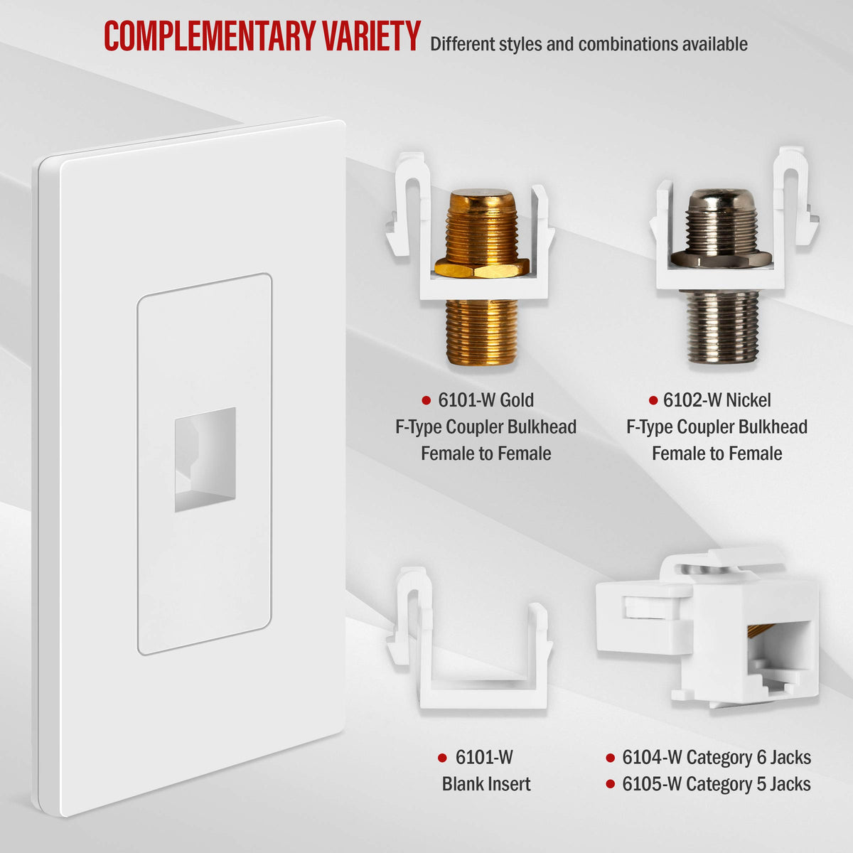General Information: Style: White / 1 Port Type: Keystone Wallplate Application: Keystone Jack Insert: Rj11, Rj45, Cat5, Cat6, F-Type Coaxial Cable Connector, Ethernet, Hdmi, Audio/Video, And Other Keystone Jacks. Wall Plate Structure: Height Is 4.69 , Length Is 2.93 And Depth Is 0.27 Keystone Port Size: .60Inch X .50Inch,1.7Cm X 1.3Cm Comes With Two Screws And Childproof Snap On Cover Technical Information: Material: Heat And Fade Resistant Polycarbonate Thermoplastic (Withstand Heat Up To 140C/284F) Mounting: Wall Box 1 Receptacle For Keystone Cutout Si8871 Decorative Childproof Screwless Wall Plate Is A Single Gang 1 Port Keystone Wall Plate Made With An Easy Snap On Cover Keeping Your Family Safe. It Is Made From Durable Polycarbonate Material Which Guarantees For A Long Usage Period.