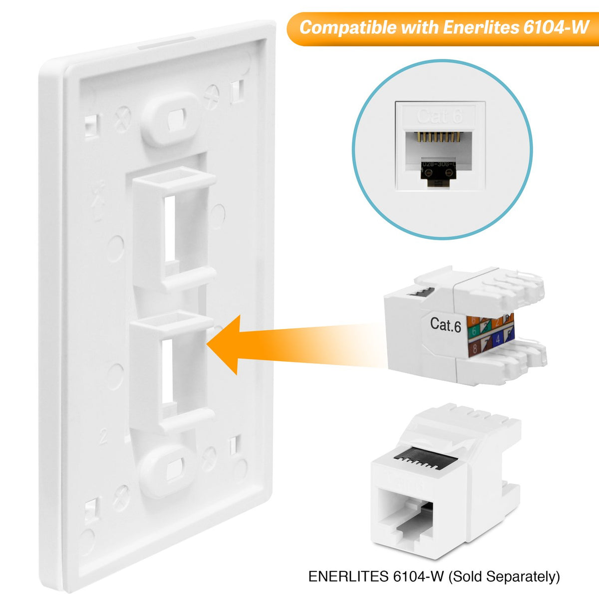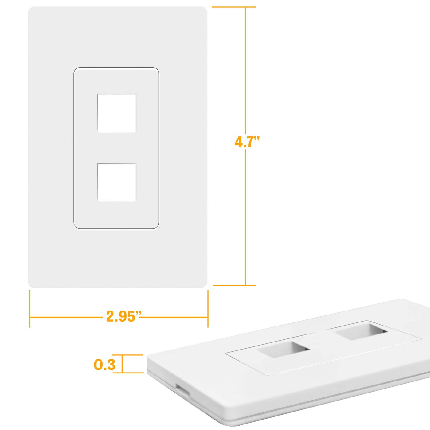 General Information: Style: White / 2 Ports Type: Keystone Wallplate Application: Keystone Jack Insert: Rj11, Rj45, Cat5, Cat6, F-Type Coaxial Cable Connector, Ethernet, Hdmi, Audio/Video, And Other Keystone Jacks. Wall Plate Structure: Height 4.69 , Length 2.93 And Depth 0.27 Keystone Port Size: .60Inch X .50Inch,1.7Cm X 1.3Cm Comes With Two Screws And Childproof Snap On Cover Technical Information: Material: Heat And Fade Resistant Polycarbonate Thermoplastic (Withstand Heat Up To 140C/284F) Mounting: Wall Box 2 Receptacle For Keystone Cutout Si8872 Decorative Childproof Screwless Wall Plate Is A Single Gang 2 Port Keystone Wall Plate Made With An Easy Snap On Cover Keeping Your Family Safe. It Is Made From Durable Polycarbonate Thermoplastic Material Which Guarantees For A Long Usage Period.