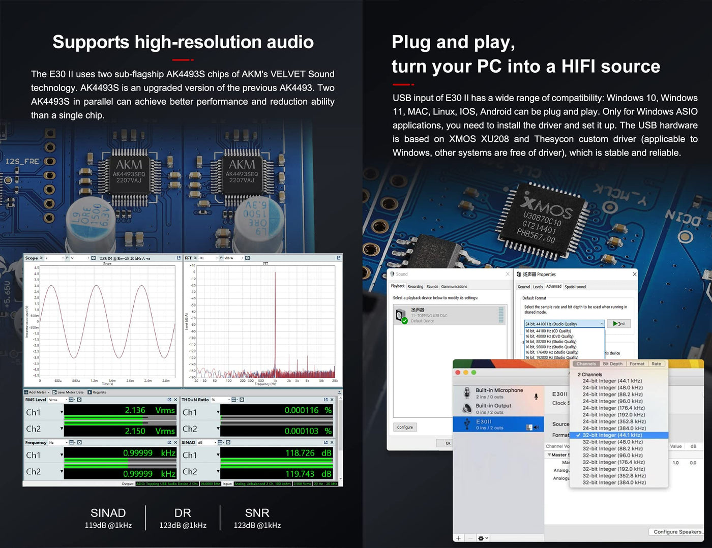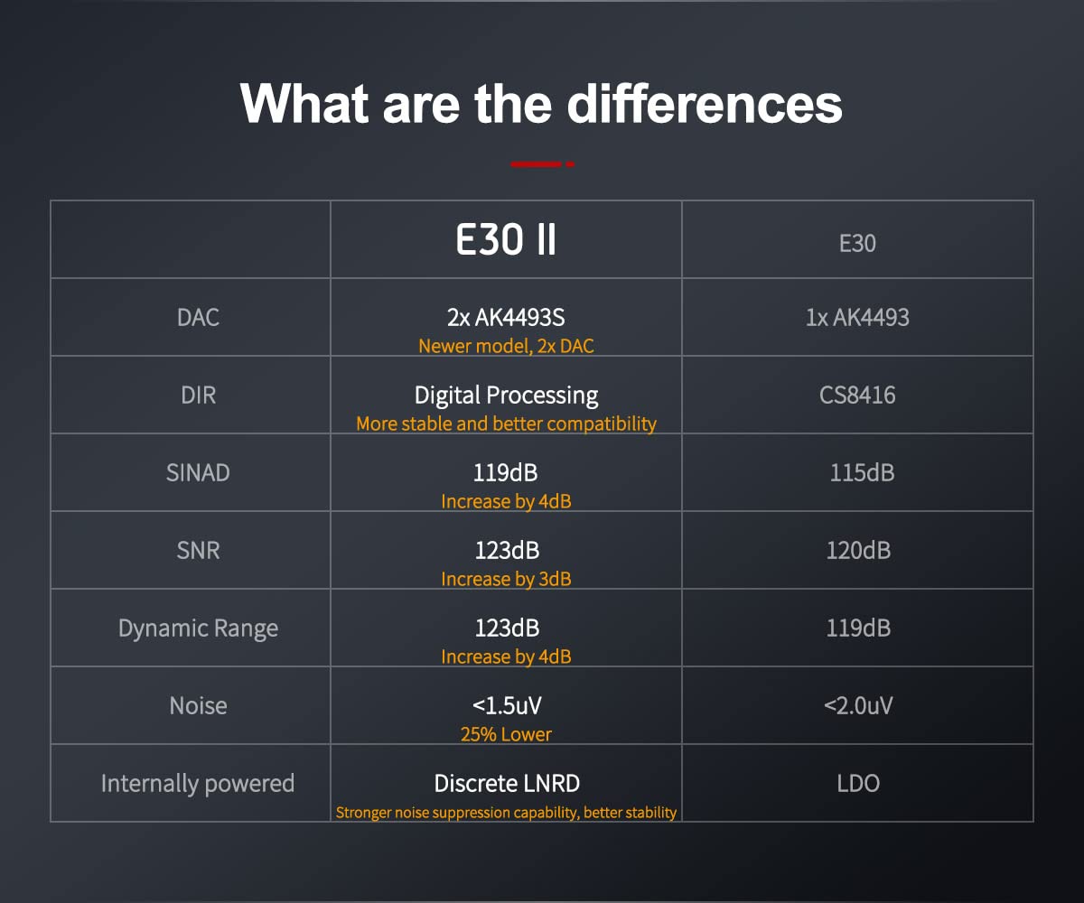 E30 Ii Is A High Performance Dac With Usb, Coaxial And Optical Inputs.It Is Compatible With Up To 768Khz/32Bit And Dsd512. E30 Ii Is Designed For Full Digital Volume Control And Equipped With An Led Display Screen. It Can Be Used As Not Only A Dac But Also A Pre-Amplifier. We Hope It Could Bring You More Fun At Enjoying Music.