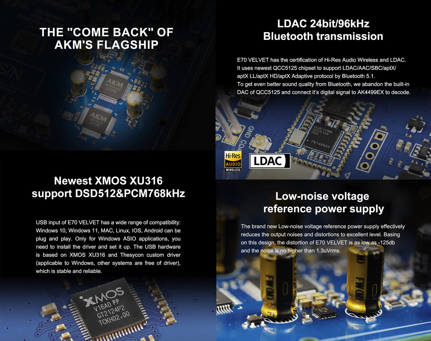 ??E70 Velvet Is A High-Performance Desktop Dac Which Supports Usb, Ldac Bluetooth 5.1, Coaxial, Optical Inputs And Rca & Xlr Output. ??Adopts Ak4499Ex And Xmos Xu316, Usb Supports Up To Pcm 32Bit/768Khz And Dsd512 Native. ??Topping Has Thrown A 24-Bit Bluetooth Chip In The Mix. Not Only Does This Support All Of The Best Codecs (Ldac, Aptx Hd, Aptx Adaptive, Aac, Etc), But Topping Made The Brilliant Choice Of Bypassing The Bluetooth Chip�S Internal D/A Functionality And Passed Those Duties On To The Much More Capable Akm Chip. This Means That The Bluetooth Should Sound Downright Gorgeous. ??We Hope It Could Bring You More Fun At Enjoying Music!