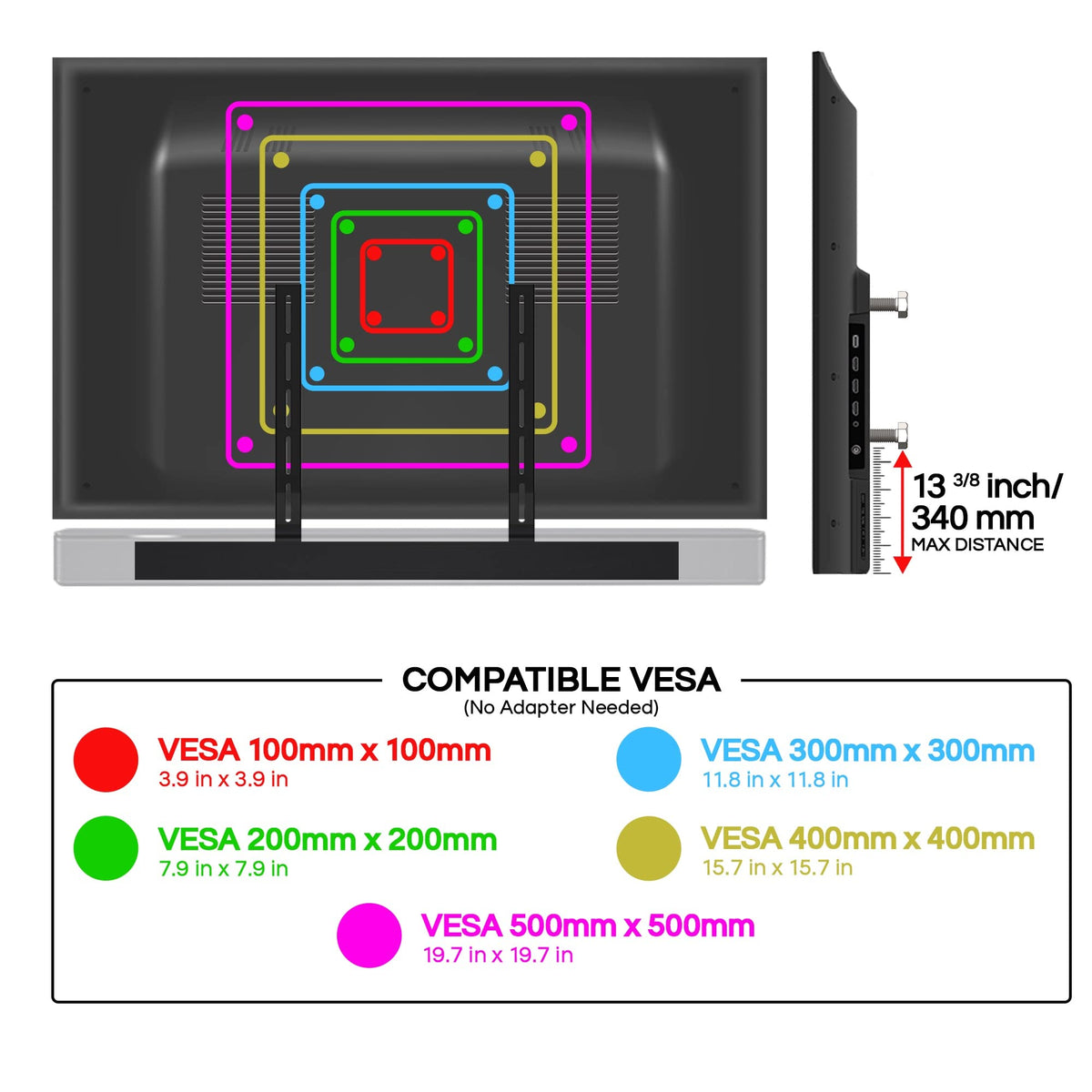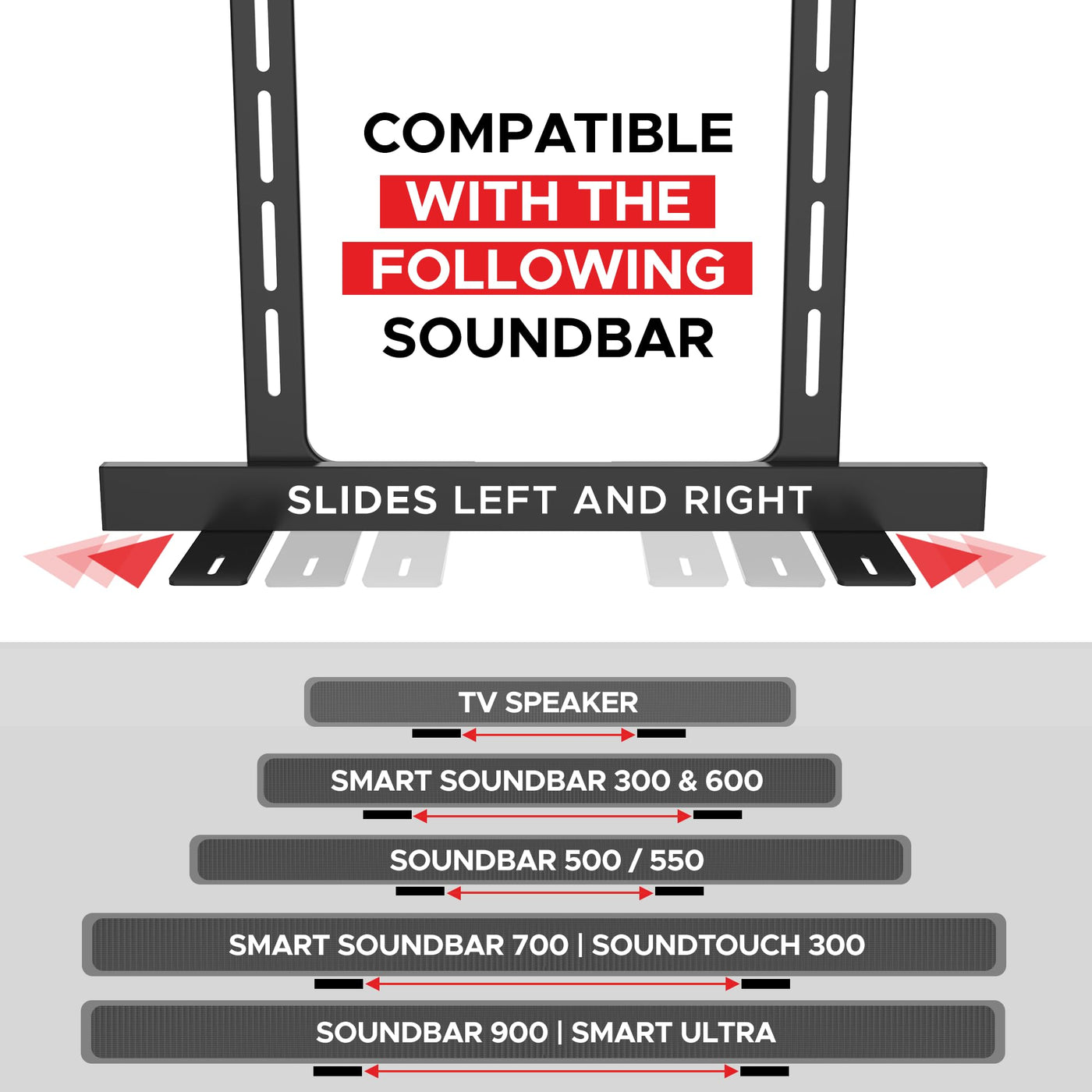 Mount-It, Introducing The Soundbass Bose Universal Tv Mount Attachment Custom-Designed Tv Mounting Bracket For Bose Soundbars Designed In England.Designed To Fit Under Or Above Mounted Tvs From 32 To 90 In. In Sizecompatible With Tv Vesa Patterns Up To 500 Mm Wide.Easily Fits Onto Your Existing Tv Wall Mount, Holds Your Soundbar Securely In Place While Allowing The Sound Of Your Soundbar To Move With Your Tv.Our Unique Patented Design Offers A Number Of Different Mounting Options, Using The Spacers You Can Position The Sonos Arc 32Mm Forward, Ensuring The Arcs Upward-Firing Drivers Are Located In Front Of The Screen And You Can Fully Harness The Power Of Dolby Atmos.Compatibility / Faqq. What Bose Soundbars Is The Tv Mount Compatible With?A. Smart Soundbar 300, Soundbar 500, Soundbar 700, Soundbar 900, Tv Speaker Or Soundtouch 300Not Compatible With Solo 5Q. What Size Tvs Can The Mount Be Used With?A. Tvs Up To 90In, But It Really Depends On The Vesa Screw Pattern On The Rear Of Your Tvq. What Vesa Patterns Can The Tv Mount Fit?A. Vesa From 100X100 To 500X500, Not Suitable For 600Mm Or 800Mm Patterns.Q. Does The Tv Need To Be Removed From The Wall To Allow Fittinga. Yes The Tv Needs To Be Removed From The Wall To Allow Fitting. Ingenious Design: Our Unique Patented Design Offers Compatibility With Most Bose Soundbars Including Soundbar 300/500/700/900, Tv Speaker Or Soundtouch 300.Easy Fitting - Allows You To Attach Bose Soundbar Securely To Most Existing Tv Wall Mounts. Moves With Your Tv When Using A Full-Motion Mount + Vertical And Horizontal Adjustment Allows Perfect Alignment With The Screen.Designed In England: By Soundbass, A Team Of Mechanical & Acoustic Engineers, We Worked To Ensure Y