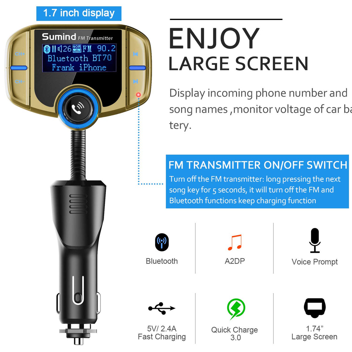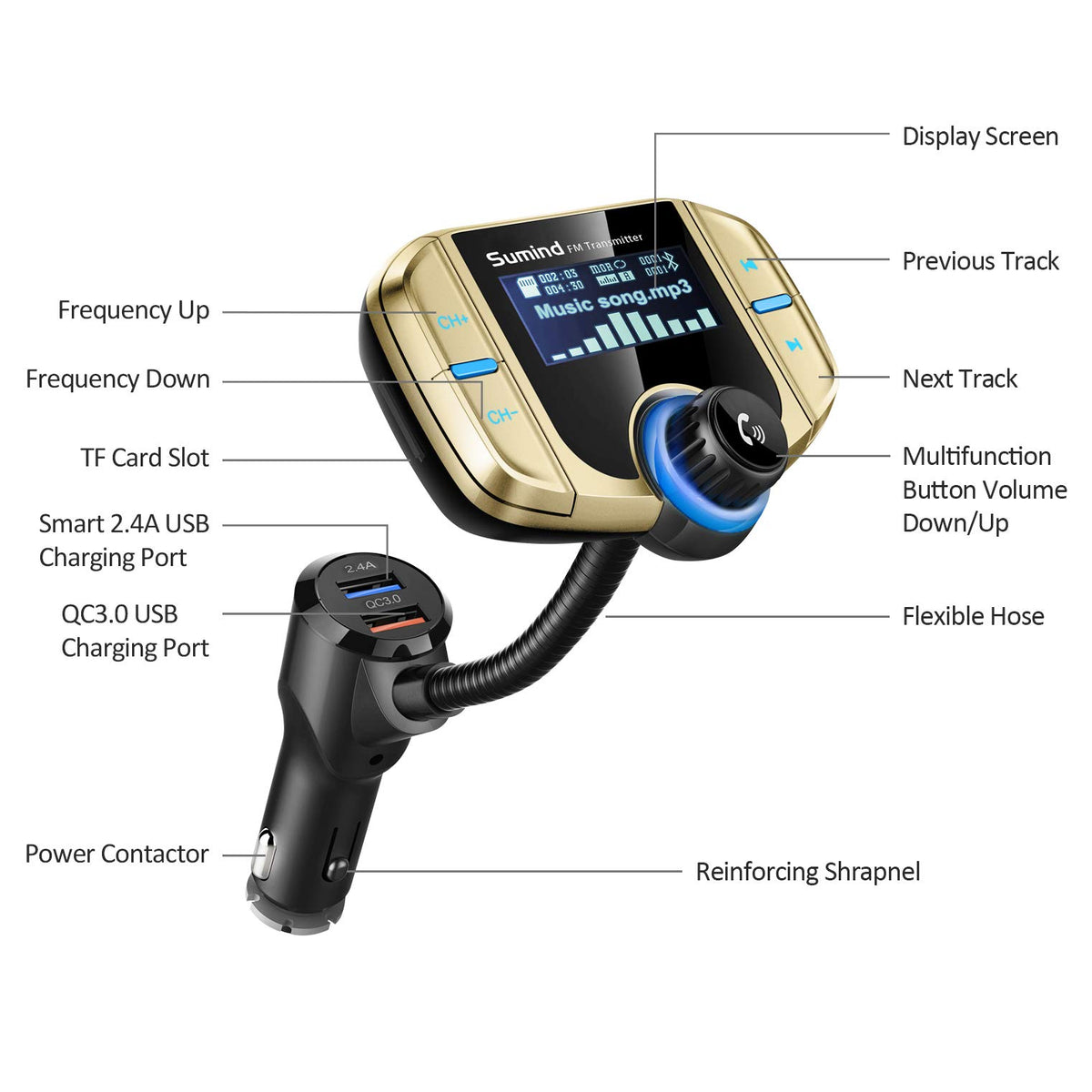 Introduction: The Device Is In-Car Mp3 Player, Equipped With Good Performance Mp3 Decoder Chip. It Can Transmit And Play Stereo Music From The Tf Card To The Car Audio Through The Fm Radio Signal. It Can Transmit Music From Mobile Phone To The Car Audio. The Device Sends The Signal Wirelessly, No Need To Modify Your Car. Features: 1. Start The Car, The Screen Will Display The Car Battery Voltage. 2. Cvc Technology To Control Noise And Storm Then To Create Full-Duplex Sound Quality 3. Support The Phone'S A2Dp Function, The Phone Will Play Music Directly When Connecting 4. When The Device Is Switched On, The Phone Can Automatically Connect 5. Support External Tf Card, Can Play Mp3/ Wma Format Music Files 6. Intelligent Charging And High-Pass Fast Charging Program Output, Can Be Applied For Car Handheld Equipment Charging 7. Orange Usb Port Supports Qc3.0 Protocol: Dc3.5-6.5 Volts/ 3A, 6.5-9 Volts/ 2 A, 9-12 Volts/ 1.5 A 8. Blue Usb Port Supports Intelligent Output Current: 5 Volts/ 2.4 Ma 9. Sound Quality-Using The Most Advanced Interference And Noise Cancellation Technology To Provide The Most Perfect Sound Quality. Turn Off The Fm Transmitter: When No Need To Use The Fm Function, Long Pressing The Next Song Key For 5 Seconds, It Will Turn Off The Fm Functions, The Screen Will Be Dark And Keep Charging Function. Specifications: Vision: V4.2+Edr Frequency: 2.4 Ghz Sensitivity: -42 Db+/3 Db 360 Effective Range: 5 Meter Rf Output: 4 Dbm Fm Frequency: Fm: 87.5Mhz-108.0Mhz Effective Range: 2 Meter Package Includes: 1 X In-Car Fm Transmitter Compatible With Bluetooth 1 X 3.5Mm Audio Cable 1 X 3A Fuse 1 X User Manual Note: The Mention Of Brand Name Above Is Only For Purposes Of Demonstrating Compatibility.