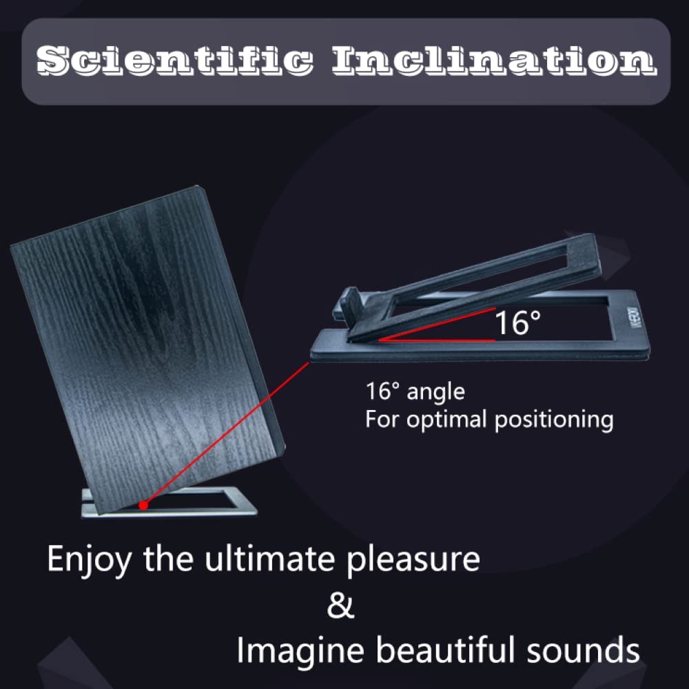 Q: What is the angle of the VKheroKV C-1 Desktop Speaker Stands?A: The VKheroKV C-1 Desktop Speaker Stands feature a 16° angle, allowing you to tilt your speakers toward your ears for an optimal listening experience and enhanced clarity of higher frequencies.