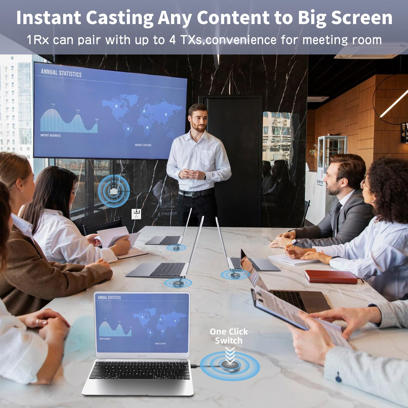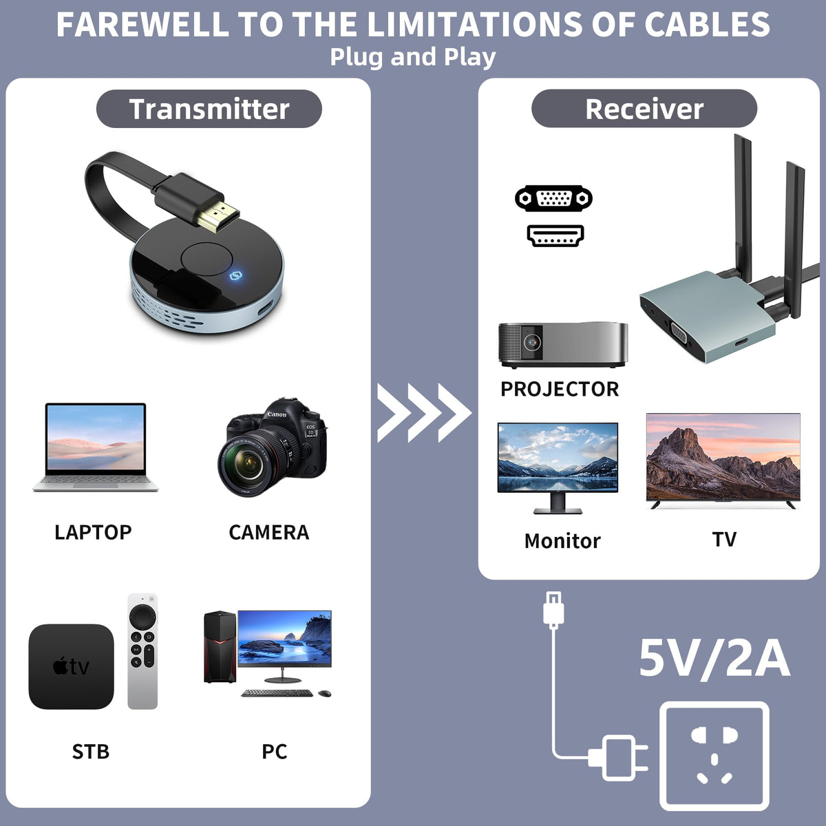 ?Wireless Hdmi Connectivity Anytime, Anywhere?Are You Bothered By Traditional Hdmi Cables?Our Product Eliminates The Hassle Of Wiring. Pre-Paired At The Factory, It Automatically Connects Within 10 Seconds After Startup. Plug And Play, No Need For Apps Or Drivers. Say Goodbye To Threading Cables Through Walls Or Ceilings, As The Powerful Long-Range Signal Can Penetrate Walls. | ?High-Speed Stable Transmission And Extended Coverage?Utilizing Dual-Band 2.4Ghz/5Ghz Technology, It Offers A More Stable, High-Speed, And Flexible Wireless Transmission Experience, Suitable For Various Usage Scenarios And Requirements. With A Transmission Range Of Up To 98 Feet/30 Meters (Open Space) And An Ultra-Low Latency Of 0.1 Second, You Can Achieve An Almost Seamless And Fully Synchronized Screen Experience. | ?Ultra-High Definition Picture Quality?The Wireless Hdmi Transmitter And Receiver Supports 4K Decoding And Ultra-High-Definition Output At 1080P@60Hz.You Can Enjoy The Most Realistic And Immersive Experience On A Big Screen.Enjoy The Pleasure Of Watching Movies And Live Sports Events With Your Friends Or Family! | ?Wide Compatibility?The Wireless Display Receiver Provides Hdmi Interface And Vga Interface For Use, Which Can Connect Two Devices At The Same Time. Compatible With Most Hdmi Devices, Laptop, Pc, Blu-Ray Player, Camera, Dvd, Dslr, Set-Top Boxes, Cable/Satellite Boxes, Tablet And More. Suitable For Conference Rooms, Home Entertainment And Multimedia Education. | ?What'S In The Box??Wireless Hdmi Transmitter * 1, Wireless Hdmi Receiver * 1, Micro Hdmi * 1, Mini Hdmi * 1, Hdmi Cable * 1, Type-C Cable * 2 And Manual * 1 .Also, If You Have Any Questions. Please Feel Free To Contact Us And We Will Reply You Within 24 Hours.