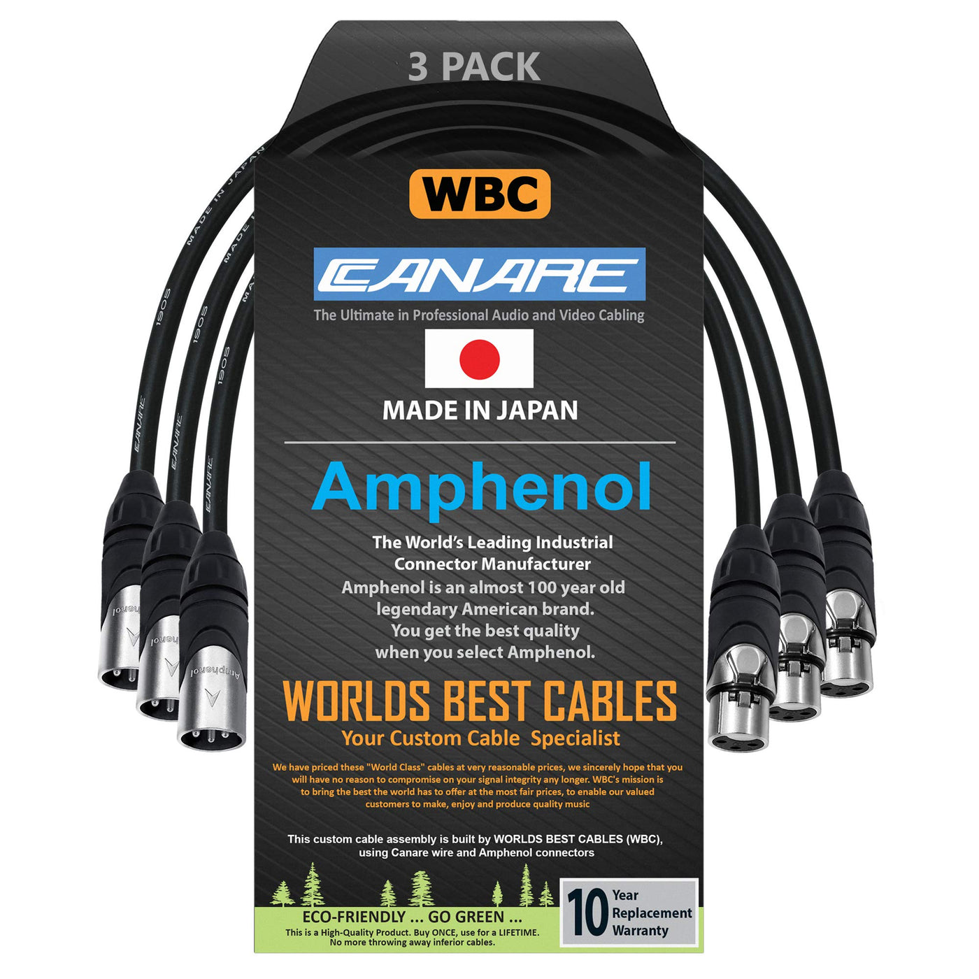 Worlds Best Cables 3 Units 1 Foot Canare L 4E6S, Star Quad Balanced Male To Female Microphone Cables With Amphenol Ax3M & Ax3F Silver Xlr Connectors Custom Made