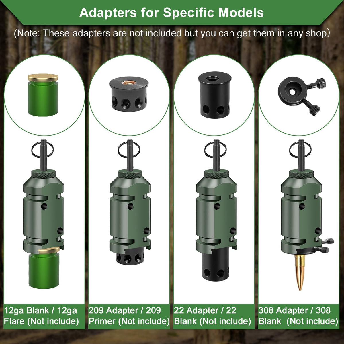 Q: What types of ammunition can be used with the 12 Gauge Camping Trip Alarm?A: The 12 Gauge Camping Trip Alarm is compatible with various ammunition types, including 12ga blanks, flares, pepper gas, and flash-bang rounds. Additionally, it can work with 209 primers using a 209 adapter, and 22 primers with a 22 adapter.