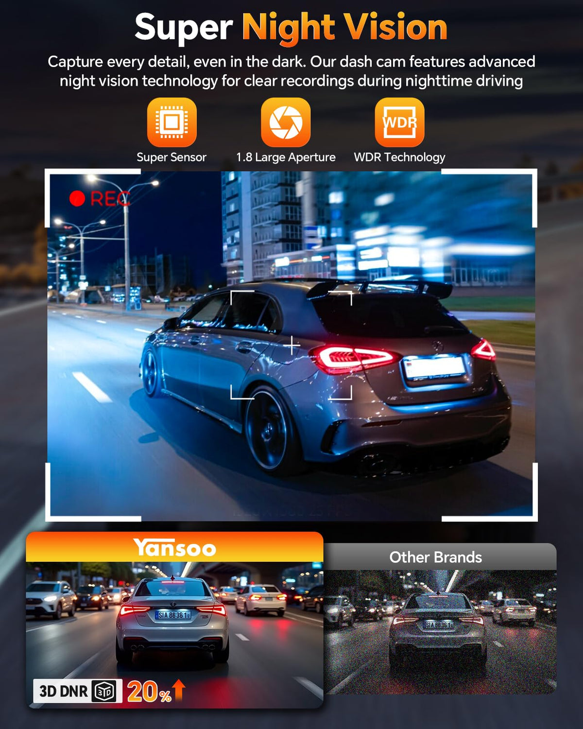 Q: What is the video resolution of the Dash Cam Front and Rear?A: The Dash Cam Front and Rear records in Ultra HD 4K resolution for the front camera and 1080P for the rear camera, ensuring high-quality video capturing for clear evidence during incidents.