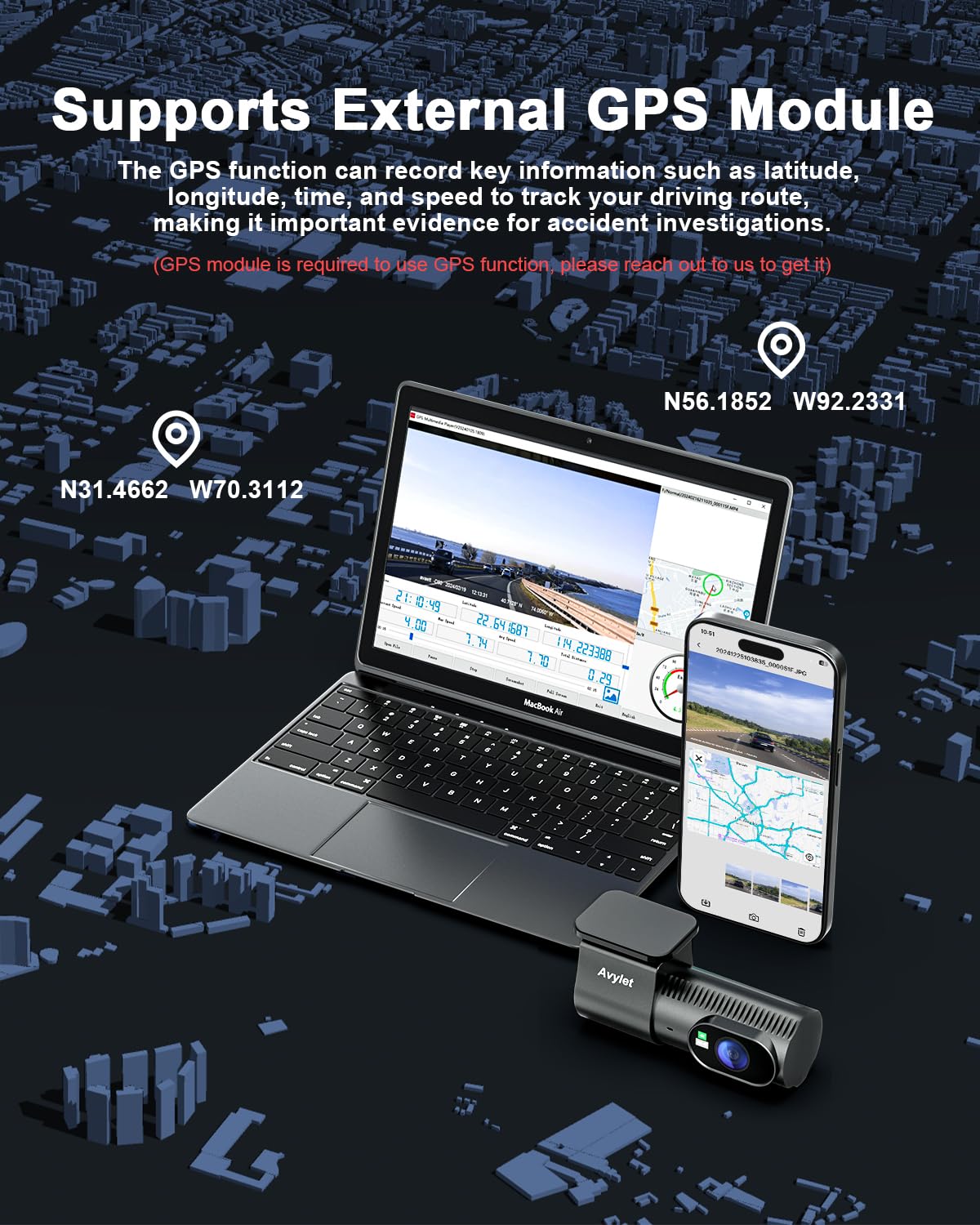 Q: Can I use an external GPS module with this dash cam?A: Yes, the dash cam supports an optional external GPS module, which records your location, route, speed, and time in the video. This information is essential for providing evidence during insurance claims.