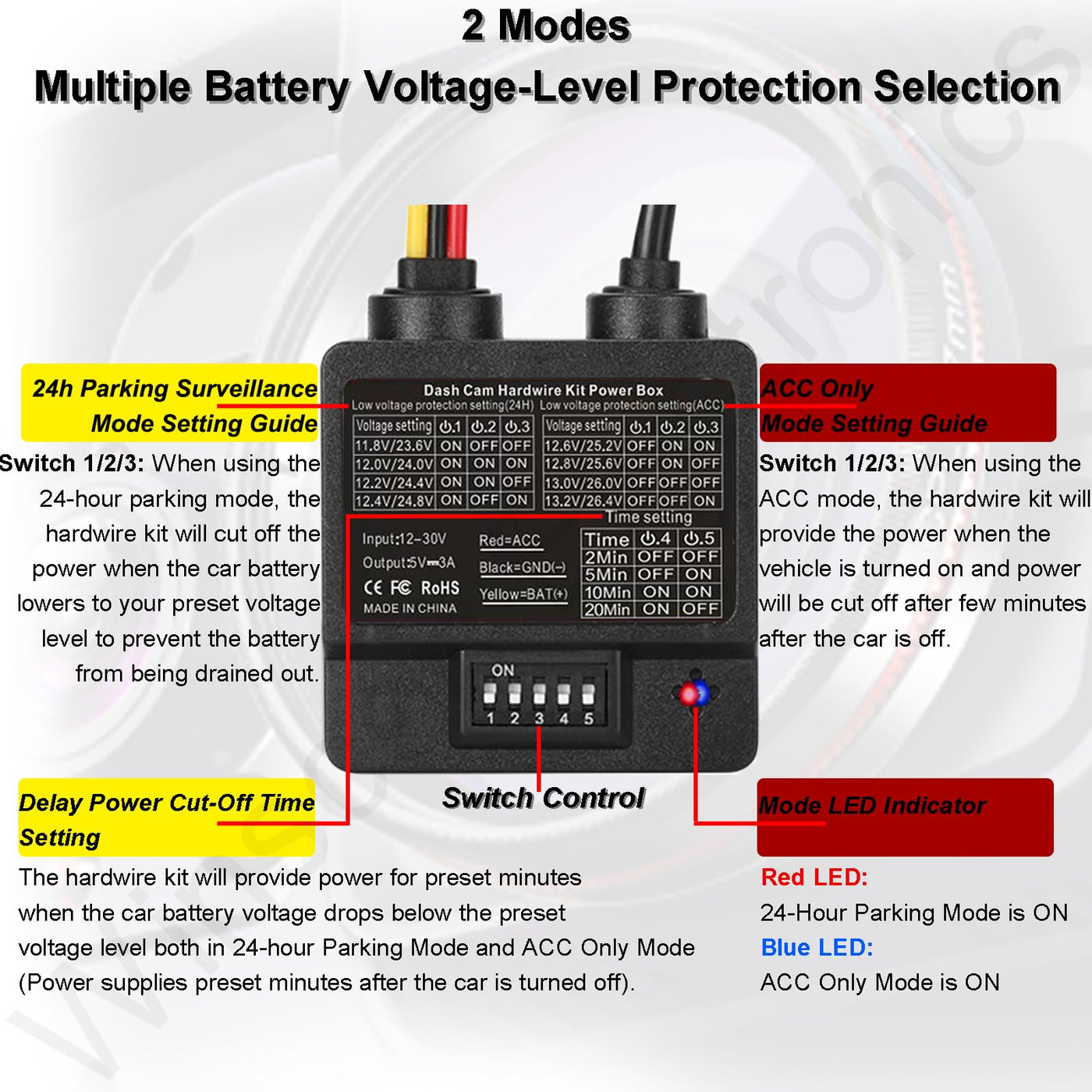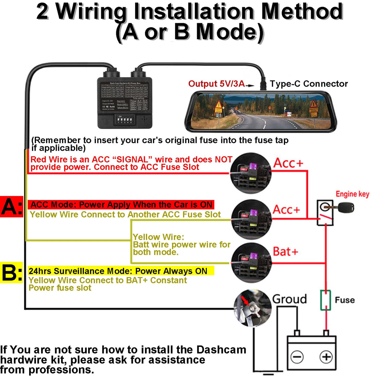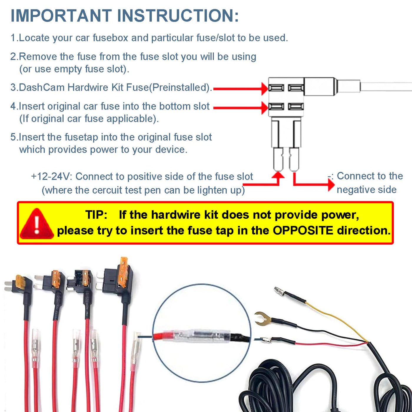[Dash Cam Hardwire Kit]: This Dash Cam Hard Wire Power Charging Cable Kit Is Compatible For Most Onboard Dash Cameras, Gps, Radar, And Dash Cams On The Market | [Acc Turn On Mode]: If You Don'T Want The Dash Cam To Record 24/7, You Can Install This Dash Cam Hardwire Kit In The Acc+ Fuse Slot To Operate The Acc Turn-On Mode, Which The Dashcam Will Only Be Powered When The Car Turns On (Recommend This Mode When You Need To Park The Car For Over A Week Or A Longer Time) | [24/7 Non-Stop Surveillance]: The Dashcam Hardwire Cable Can Connect To The Car Fuse Box To Power The Onboard Dash Cam And Keep It 24Hrs Surveillance; Also The Dash Cam Hard Wire Kit Will Cut Off The Power Supply When The Car Battery Drops To Preset Voltage Level To Prevent The Battery Drain Out | [Clean And Space Saving]: By Using This Dash Cam Hardwire Kit You Can Easily Hide The Wire And Cable To Make Your Carpet Looks Cableless And Clean; Also This Dash Cam Charger Doesn'T Occupy Your Car'S Cigarette Lighter Port And Allow You Can Use The Port To Charge Other Devices In Your Car | [Installation Note]: It Is Always Recommended To Ask For Professional Assistance When You Are Not Sure How To Hardwire The Kit With The Dashcam, The Installation Will Require Some Basic Electric And Wiring Knowledge About Your Vehicle. | [Question 1: No Power]: The Fuse Tap Insertion Requests A Correct Direction, If The Hardwire Kit Does Not Supply Power, Please Insert The Fuse Tap In The Opposite Direction. | [Question 2: No Power]: The Usb Type-C Connector Uses A5-B5 Signal Pins And May Not Be Compatible With Some Dash Cam Brands Use A8-B8 Signal Pins | [Question 3: Car Fuse]: If You Use The Fuse Slot That Already Has A Fuse In It, Please Remember To Insert It On The Fuse Tap Bottom Fuse Slot.