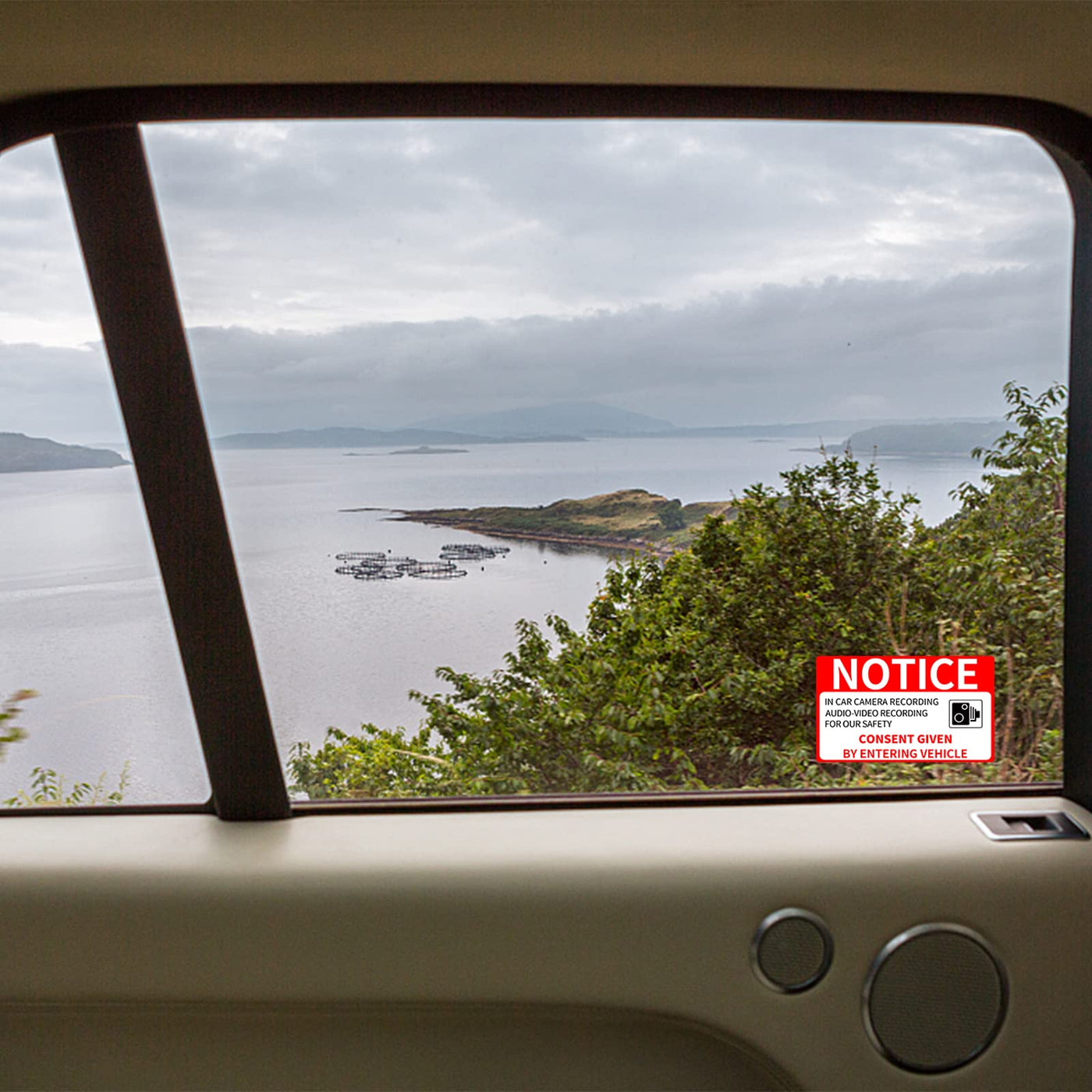Q: What are the dimensions of the in-car camera recording sign?A: The in-car camera recording sign measures 5 x 3 inches (7.5 x 5 cm), making it a compact and visible option for vehicle windows.
