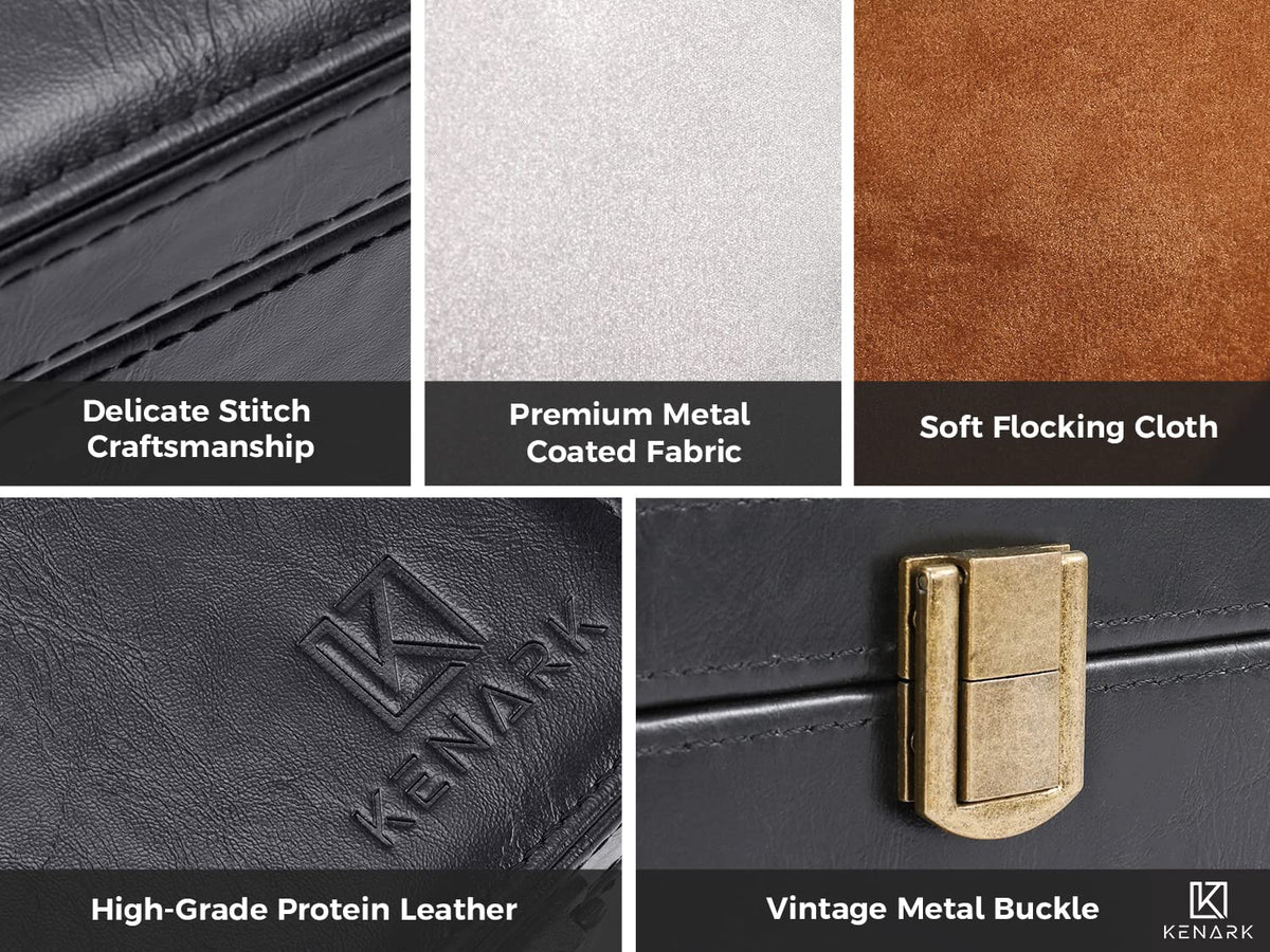 Q: What materials are used in the construction of the KENARK Faraday Box?A: The KENARK Faraday Box is crafted from high-quality protein leather and velvet cloth, combined with a sturdy wooden board and retro metal buckles, offering both durability and a luxurious aesthetic.