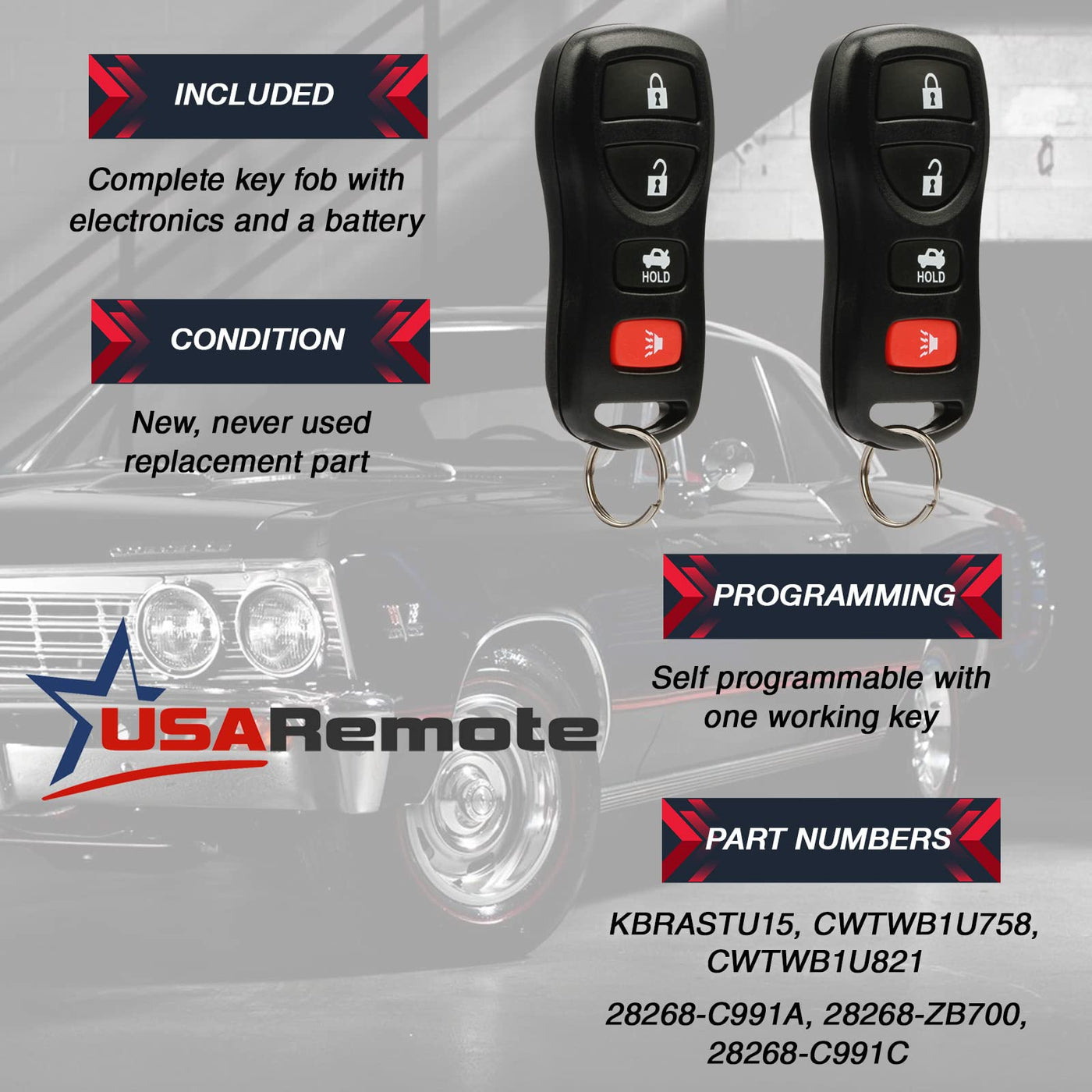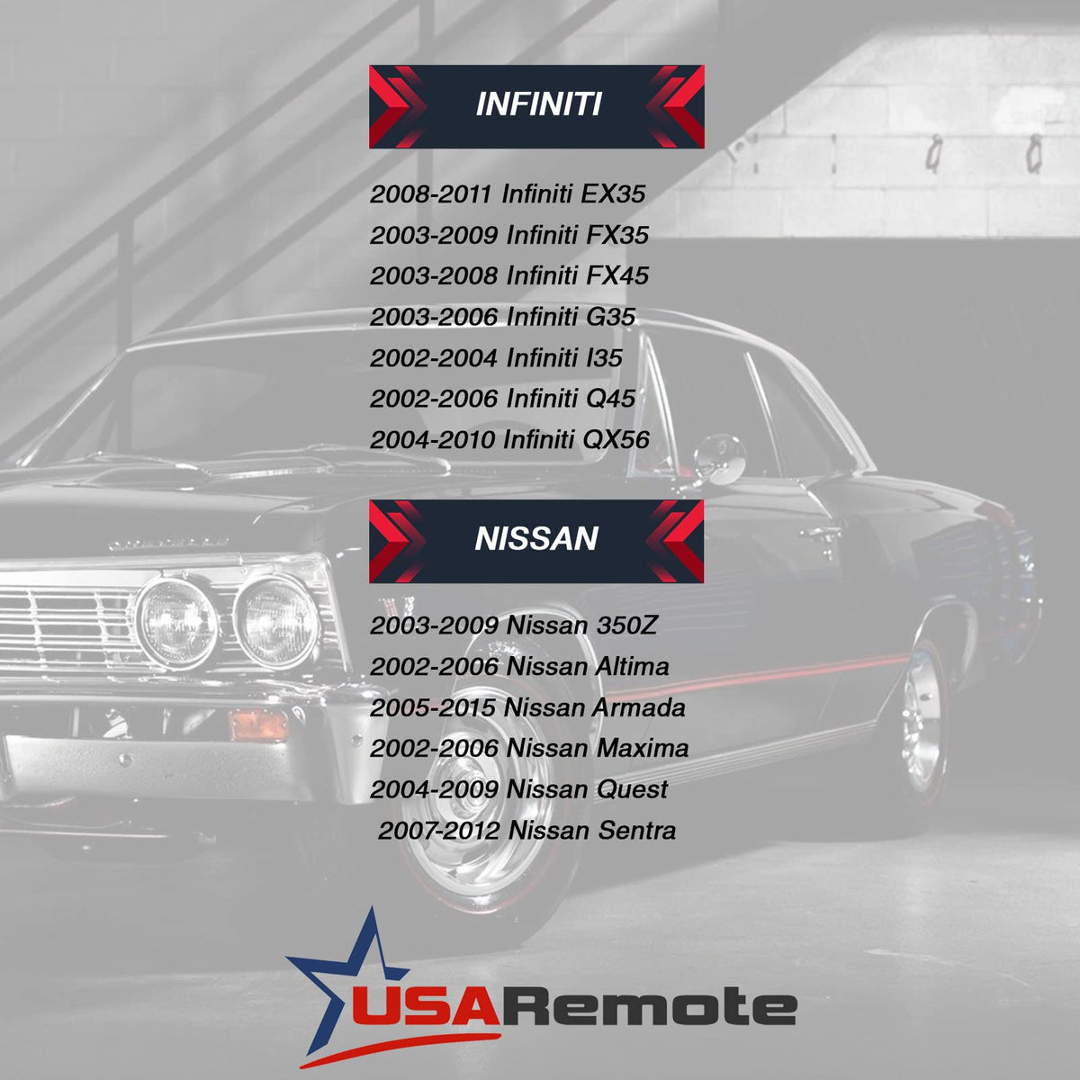 Replace Your Lost Or Broken Keyless Entry Key Fob Remote With A Usaremote Fob Fits Pn: Kbrastu152008-2011 Infinity Ex352003-2009 Infinity Fx352003-2008 Infinity Fx452003-2006 Infinity G352002-2004 Infinity I352002-2006 Infinity Q452004-2010 Infinity Qx562003-2009 Nissan 350Z2002-2006 Nissan Altima2005-2015 Nissan Armada2002-2006 Nissan Maxima2004-2009 Nissan Quest2007-2012 Nissan Sentra