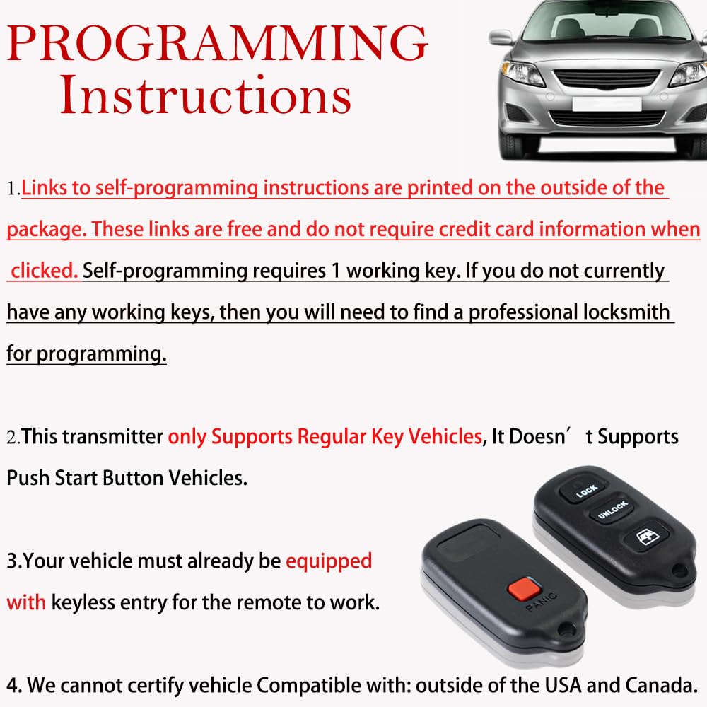 Note:This Is Aftermarket Remote Key Fob/Non-Oem, And It Doesnt Come With Logo Or Badge. Important Note:It Only Supports Regular Key Vehicles, It Doesnt Supports Push Start Button Vehicles. Will Not Work For Vehicles With Passive Entry Passive Start (Also Called Peps, Push Button Ignition, Smart Key Or Proximity System) Compatible With Toyota Models: 1999-2009 Toyota 4Runner 2001-2007 Toyota Sequoia Replacement For: Fcc Id: Hyq12Bbx, Hyq12Ban, Hyq1512Y Part Numbers: 89742-35050 Programming: Self-Programming Instructions Link Will Be Provided With Every Order. This Transmitter Doesn'T Work On Push Start Button Vehicles. 4 Buttons Remote Frequency: 315 Mhz Battery Type: Coin / Button Cell Note:This Replacement Key Fob Will Not Work If Your Original Remote Had A Red Or Green Light On Top!