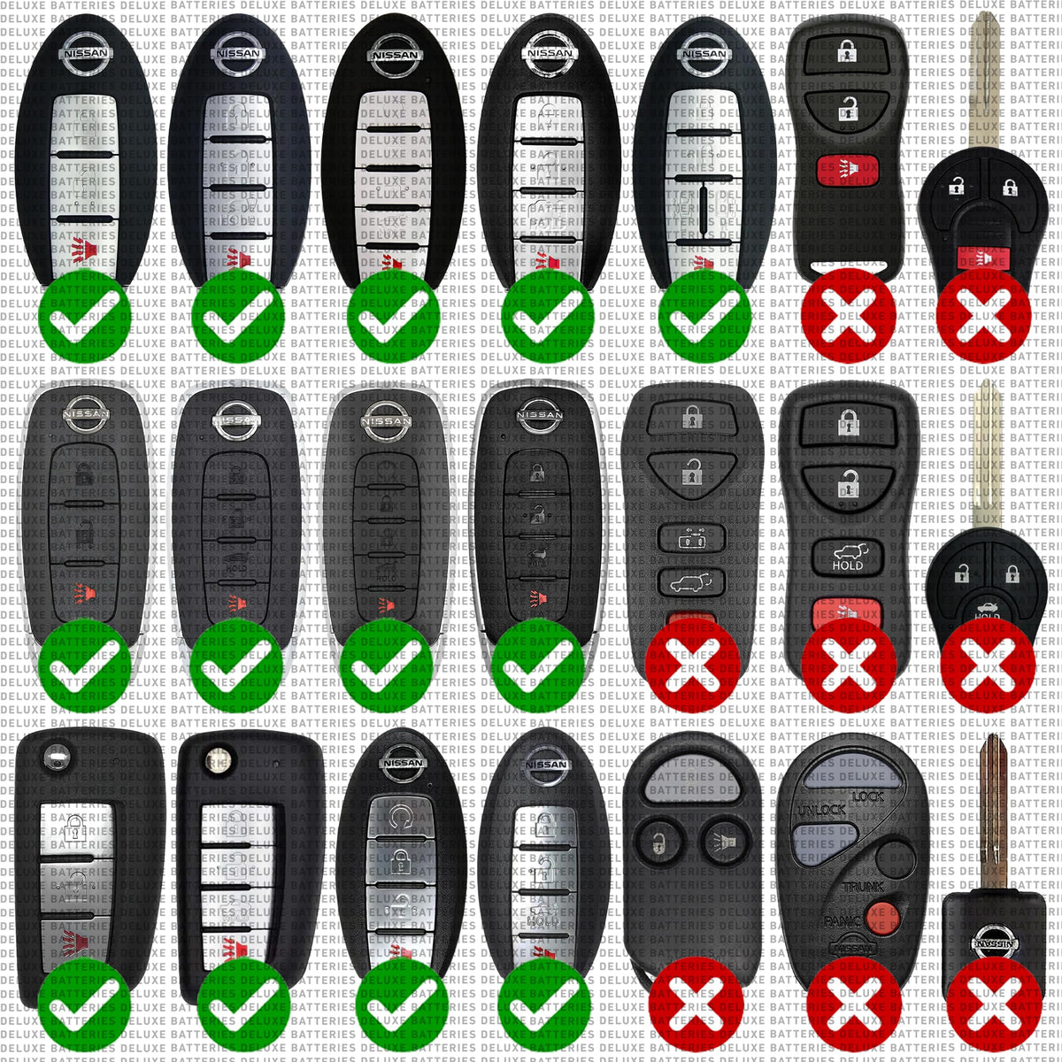 Q: How do I know if this key fob battery is compatible with my Nissan vehicle?A: To ensure compatibility, please refer to the fitment guide located in the product images. This battery is specifically designed for Nissan smart key fobs, including models like Rogue, Altima, Sentra, and more. If your key fob matches one of the examples provided in the guide, it should work perfectly.