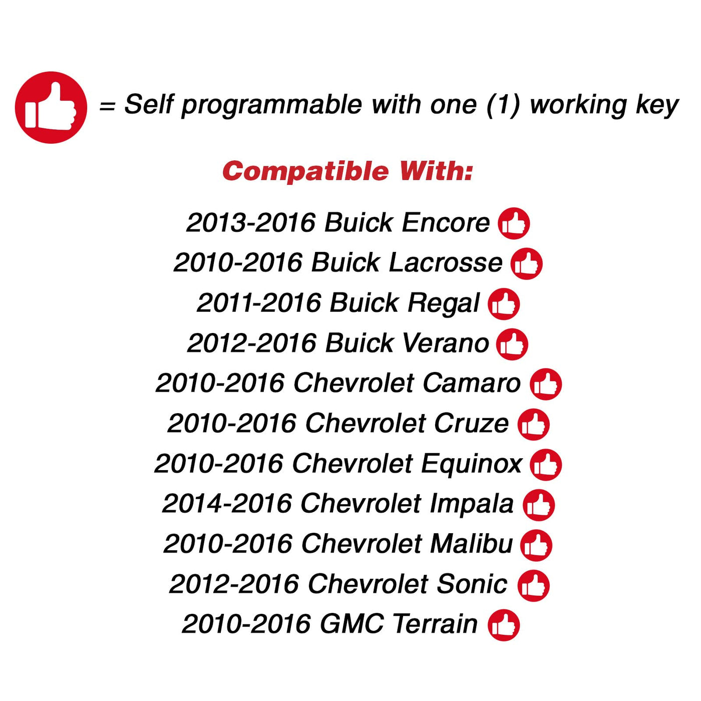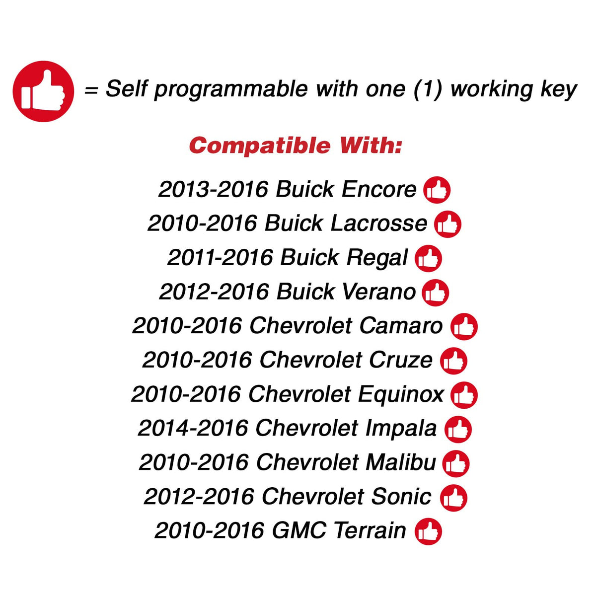 Q: Is this key fob compatible with my Buick Encore?A: Yes, this KeylessOption Key Fob Replacement is compatible with Buick Encore models from 2010 to 2019. It is designed specifically for GM vehicles.