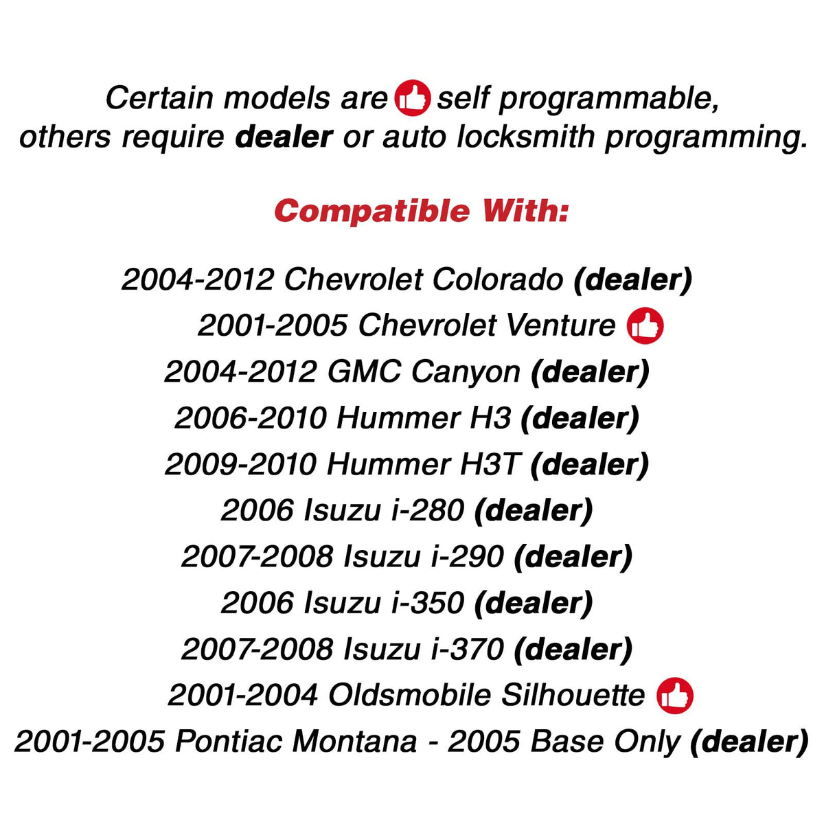 Q: Is this key fob compatible with my Chevrolet Colorado?A: This KeylessOption key fob replacement is specifically designed for Chevrolet Colorado models from 2001 to 2012. To ensure compatibility, please use the parts finder tool and visually compare the part number L2C0007T with your original remote.
