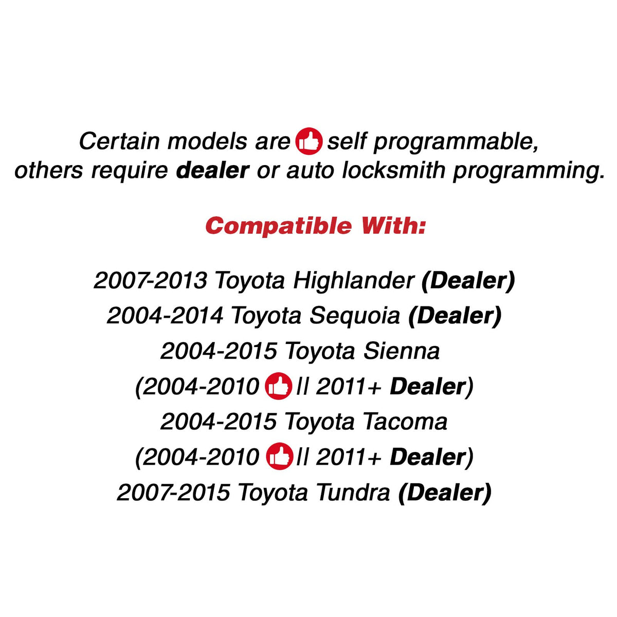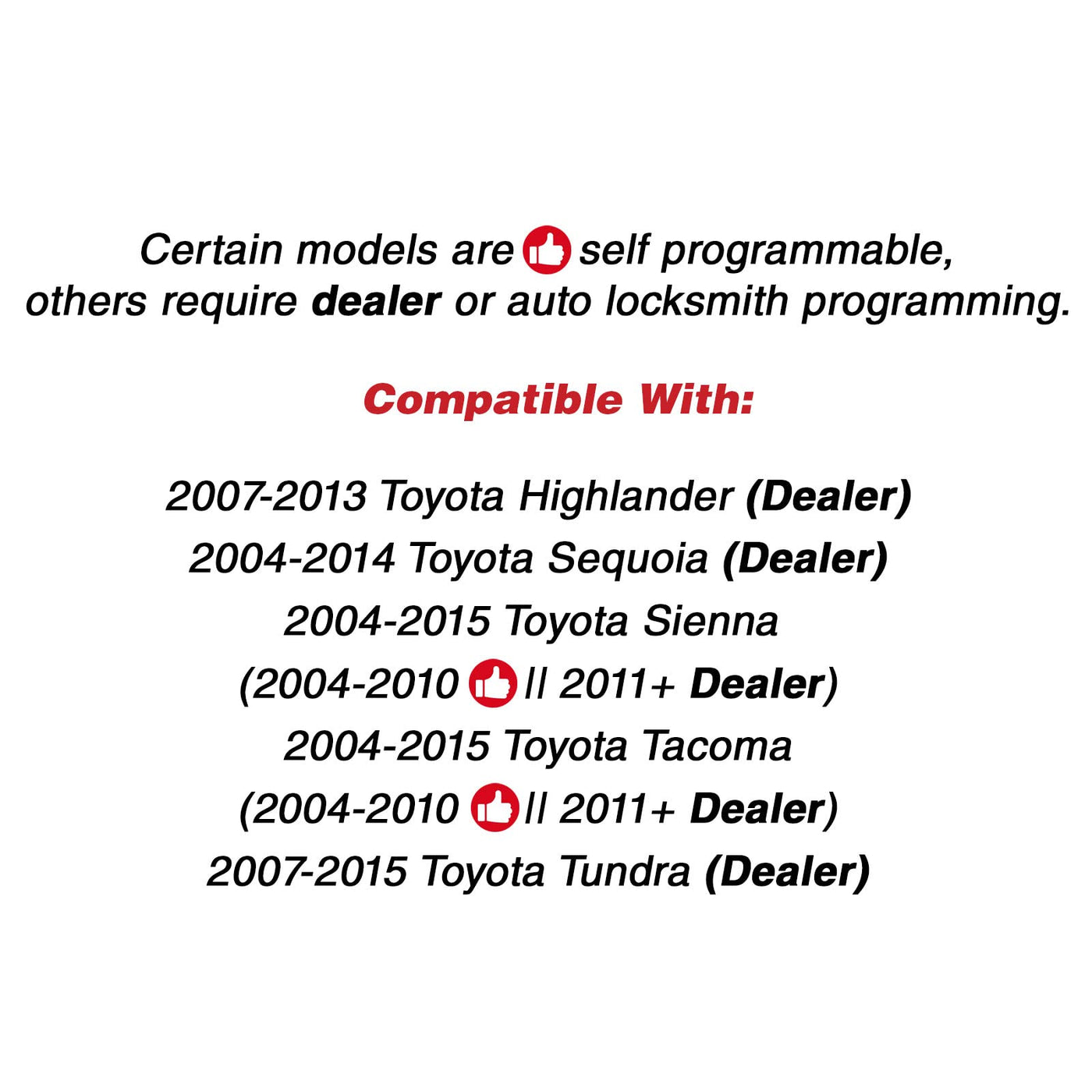 Keylessoption Is A Quick, Easy And Affordable Way To Replace Your Keyless Entry Remote Control Car Key Fob. Replacement Keyless Entry Remote With Battery And Electronics Installed. Easy To Follow Step By Step Diy Programming Instructions Are Included With Your Purchase Some Vehicles Require Dealer Or Locksmith Programming. Please Enter Your Year Make Model Into The Parts Finder To Verify This Item Is Compatible. Please Verify The Vehicle Is Equipped With Original Keyless Entry. If The Original Remote For The Vehicle Has A Red Or Green Light This Part Is Not Compatible. If Your Vehicle Has A Push To Start Ignition This Remote Will Not Work. This Item Is Not Compatible With Smart Key Systems. All Highlanders, Sequoias, And Tundras Require Dealer Or Locksmith Programming. 2011 + And Above Siennas And Tacomas Require Dealer Or Locksmith Programming Only.