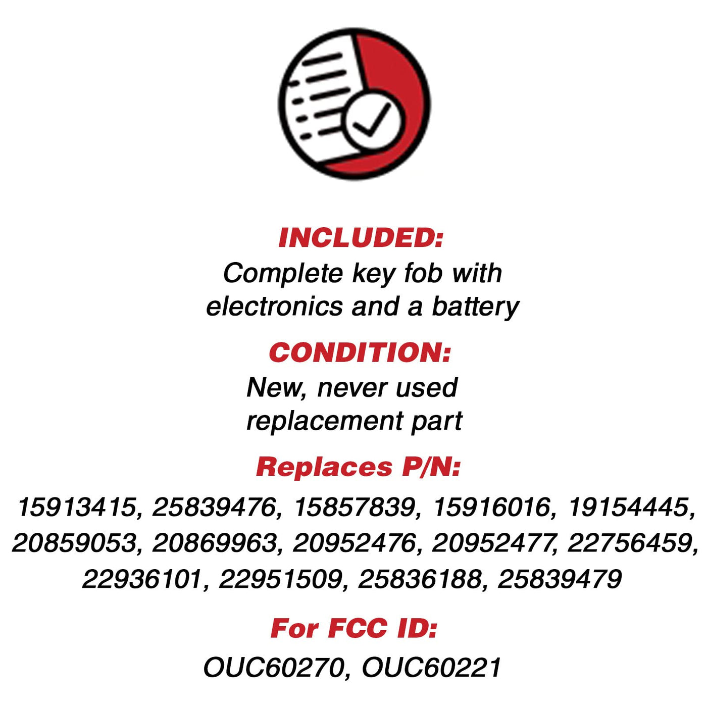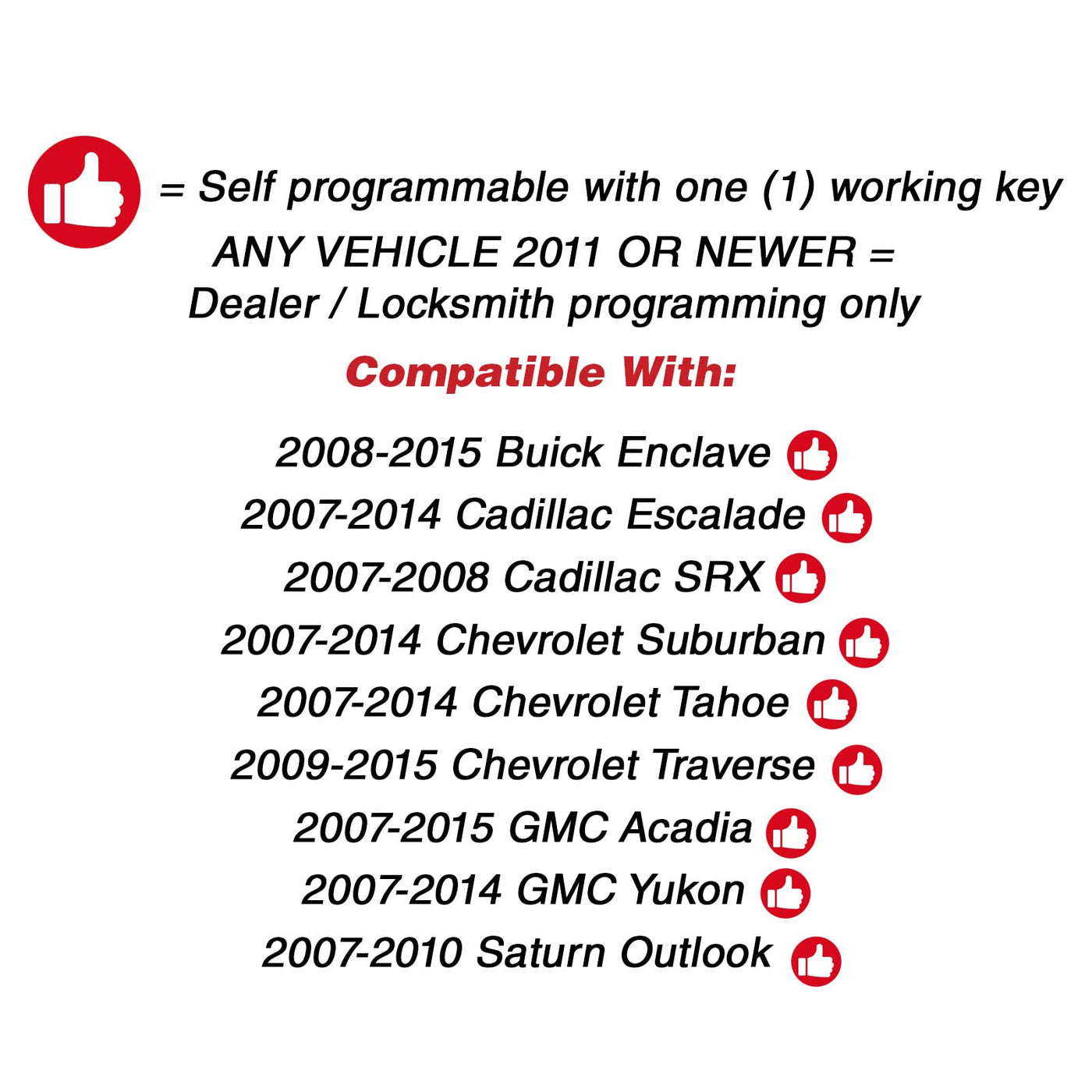 Q: Is this key fob compatible with my Buick/Chevrolet vehicle?A: This key fob is designed to replace the original remote for various Buick, Cadillac, Chevrolet, Chevy, GMC, and Saturn models from 2007 to 2017. Please verify compatibility by matching the part number 15913415 or using the parts finder.