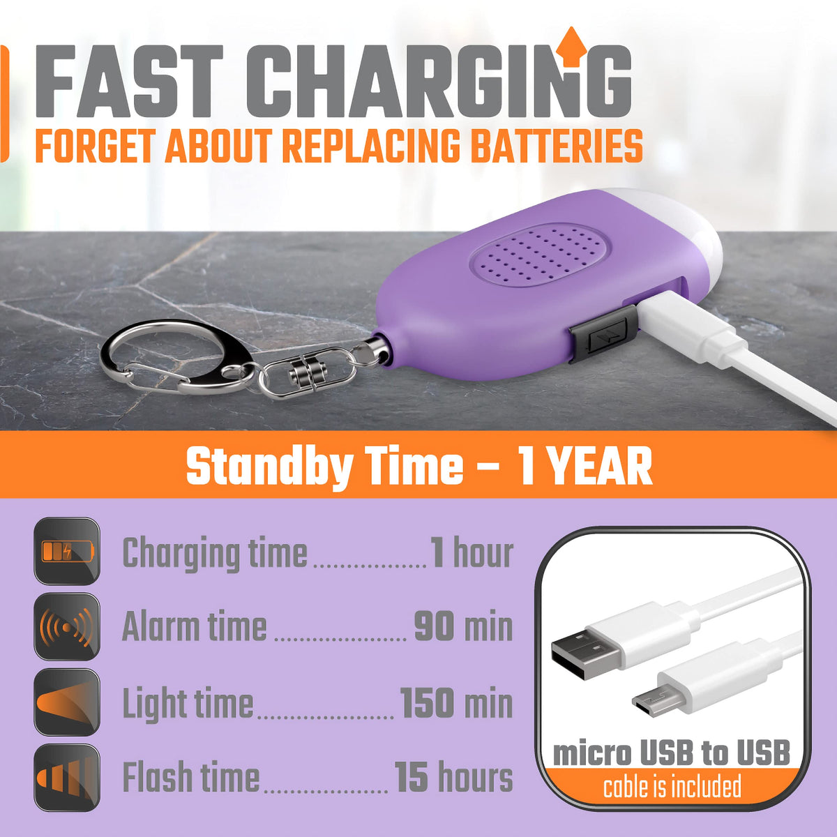 Q: How do I recharge the WETEN Personal Alarm Keychain?A: The WETEN Personal Alarm Keychain comes with a USB charger cable. It fully charges in just 1 hour, providing up to 90 minutes of continuous alarm use and about 1 year in standby mode, so you don't have to worry about replacing batteries.
