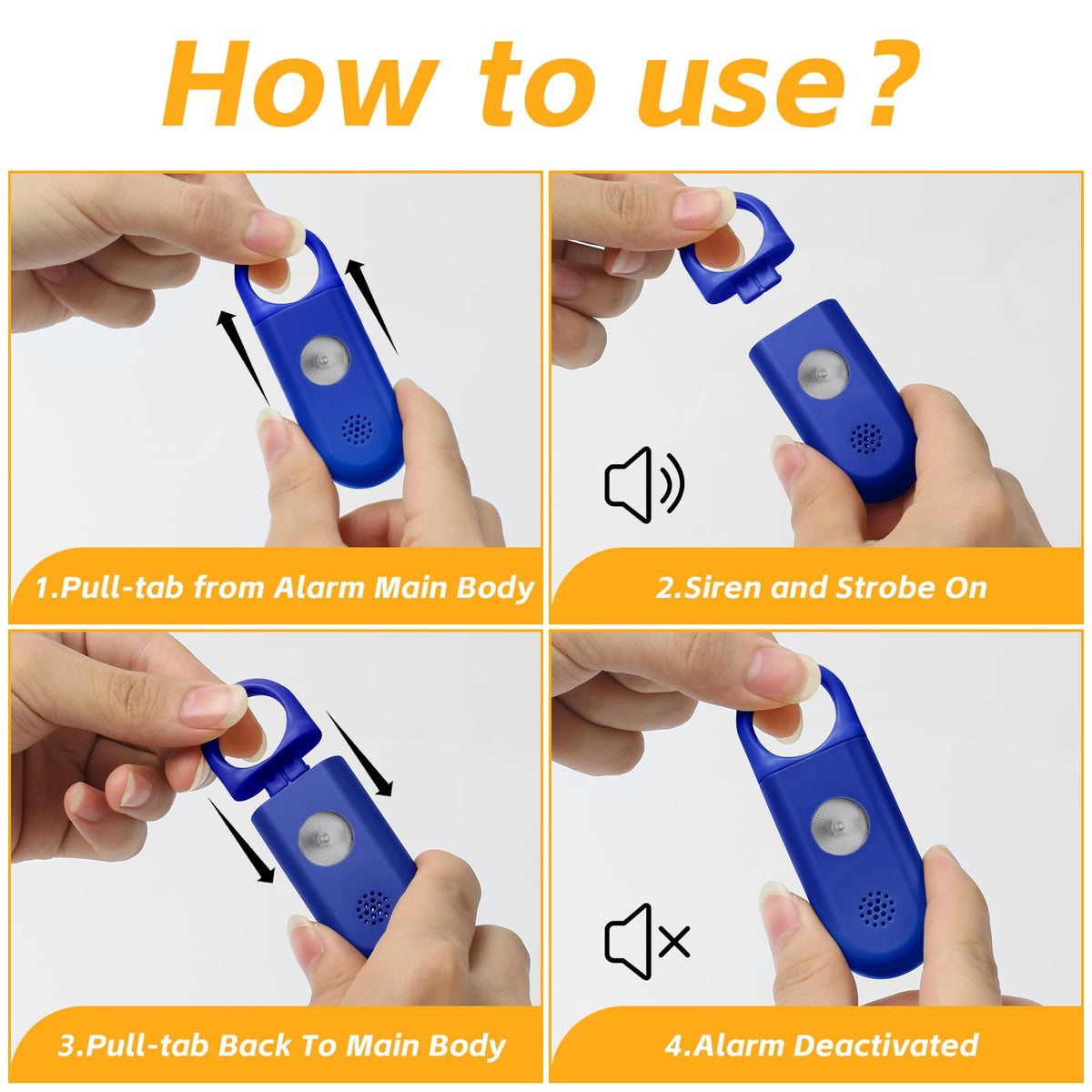 Q: What safety features are included with this alarm?A: The alarm features a keychain design for easy portability, a loud siren for effective deterrence, and a strobe light for visibility in emergencies.