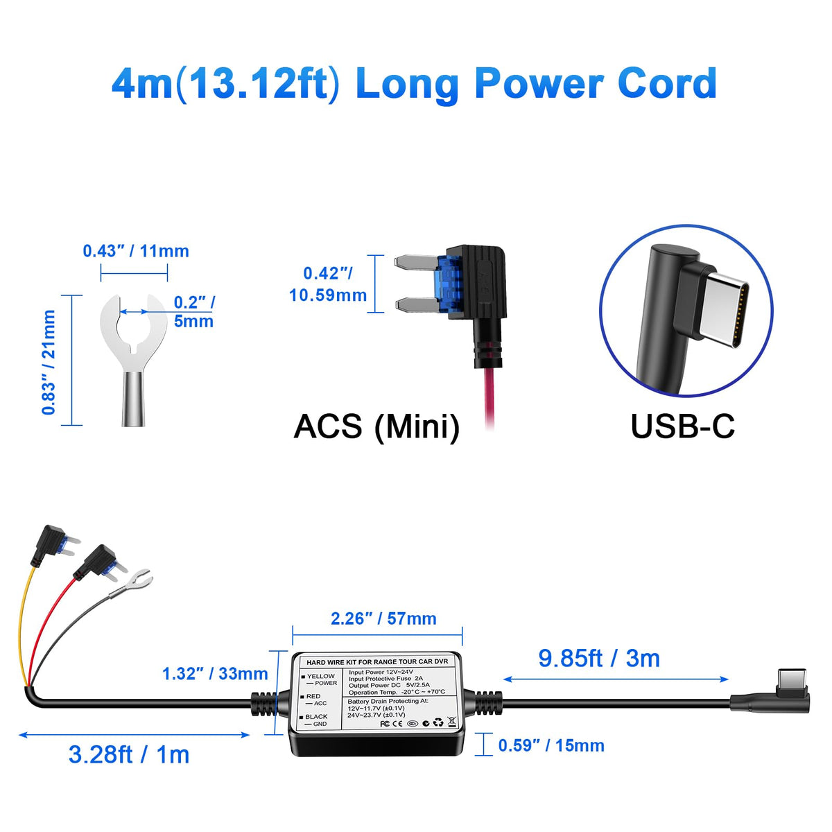 Range Tour Hardwire Kit For Dash Cam, 12V 24V To 5V 2.5A Car Dash Camera Charger Power Cord Usb C Hard Wire Kit Fuse For Dashcam