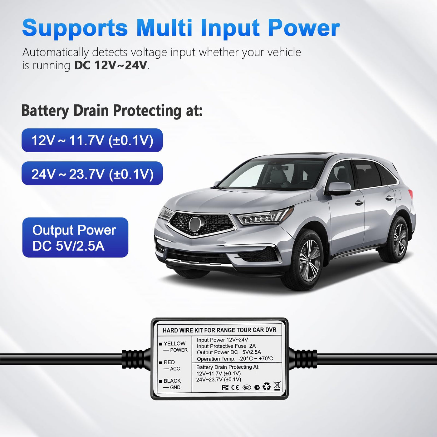 Q: How does the low voltage protection feature work?A: The hardwire kit is equipped with a sensitive voltage sensing switch that monitors the vehicle's battery voltage in real time. If the voltage drops below 11.7V or 23.7V, the kit automatically cuts off the power supply to protect the battery and ensure there is enough power left to start the engine.