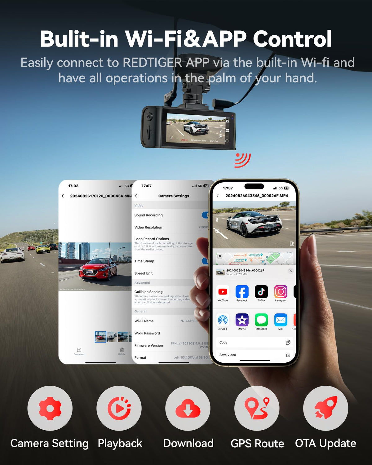 Brand Story: Redtiger Is A Leading Innovator In The Automotive Electronics Industry, Driven By A Passion For Creating Products That Enhance Safety, Convenience, And The Driving Experience. Founded By A Team Of Engineering Experts, We Are Committed To Pushing The Boundaries Of What'S Possible With In-Vehicle Dash Cam Front And Rear Wireless Technology. Our Mission Is To Provide Our Customers With The Most Advanced, Reliable, And User-Friendly Wireless Dash Cams On The Market - Empowering Drivers To Navigate The Roads With Confidence And Peace Of Mind. Product Story: Introducing The 2024 Vital Redtiger F7N Pro Car Dash Cam- Our Latest Masterpiece In The World Of Camera For Cars And Best Rated Dash Cam. Designed To Be The Ultimate Companion For Modern Drivers, This Dual-Channel Car Dash Cam Front And Back Offers An Unparalleled Combination Of Cutting-Edge Features And Exceptional Performance. Prepare To Experience A New Level Of Road Safety And Video Recording Quality That Will Redefine Your Daily Commute. Product Function Detailed Explanation: At The Heart Of The Mini F7N Pro Dashcams For Cars Is Its Remarkable 4K+1080P Dual-Channel Recording Capability. The Dash Cam Front Captures Vivid, Ultra-Hd Footage At 24 Frames Per Second, While The 1080P Reverse Camera Provides A Comprehensive View Of Your Vehicle'S Surroundings. With A Combined 170+140 Wide-Angle Coverage, You Can Rest Assured That Every Critical Moment Is Documented With Crystal Clarity. The F7N Pro'S Advanced Imaging Technology Is Further Enhanced By Its Super Night Vision And Wdr Hdr Features. Equipped With An F1.5 Aperture And 6 Layers Of Precision Optics, This Dash Cam Wireless Delivers Superior Low-Light Performance, Ensuring Clear Recordings Even In Challenging Outside Nighttime Conditions. The Wdr Hdr Function Automatically Adjusts Exposure To Maintain Optimal Image Quality, Regardless Of Changing Lighting Conditions. Connectivity And Convenience: Seamlessly Integrated Gps And Wifi Capabilities Take The Cheap F7N Pro Wireless Dash Cam Front And Rear To The Next Level. The Built-In Gps Module Tracks Your Location, Speed, And Time, Providing Valuable Data For Insurance Claims And Incident Analysis. The Wifi Feature Allows For Easy Wireless Data Transfer And Over-The-Air Firmware Updates, Ensuring Your Discreet Device Is Always Up-To-Date With The Latest Enhancements. The Affordable Car Cam Can Be Remote Controlled Via The Redtiger App On Your Smart Phone, Making It Easy To Complete A Series Of Operations. Specification Information And Usage Instructions: 4K Uhd Dashcam Front Camera, 1080 Full Hd Backup Camera 170 Front, 140 Rearview Angle Super Night Vision With F1.5 Aperture And 6-Layer Optics Wdr Hdr Technology For Optimal Image Quality Built-In Gps And Wifi For Location Tracking And Ota Updates Loop Recording, Collision Detection, And Parking Monitor 360 Rotatable Gps Mount For Flexible Installation 24-Hour Car Security Mode For Continuous Monitoring 64 Gb Micro Memory Card Included To Use The F7N Pro Dash Cam Front And Inside, Simply Mount The Device On Your Windshield Using The Included 180 Rotatable Gps Mount. The Dash Camera For Cars Front And Rear Will Automatically Start Recording Upon Vehicle Ignition, Capturing Every Journey With Uncompromising Quality. Enjoy The Peace Of Mind That Comes With Comprehensive Footage, Perfect For Protecting Yourself In The Event Of An Accident Or Insurance Claim. At Sametime, It Is Equipped With Top Heat Resistant Supercapacitor, Which Has A Longer Service Life And Durability Compared To Ordinary Batteries. Additional Information:Bak The Redtiger F7N Pro Is Backed By Our Industry-Leading 18-Months Warranty And Exceptional Customer Support. Should You Ever Encounter Any Issues With Your Small Driving Recorder, Our Dedicated Team Is Always Here To Assist You Promptly And Efficiently. Experience The Ultimate In Road Safety And Video Recording With The Redtiger F7N Pro Dual Channel 4K Dash Cams.