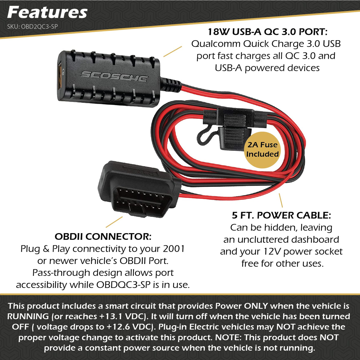 The Scosche OBD2QC3 lets you quickly power and safely install your Scosche Nexar, Dash Cam, Qi Wireless Charger or USB device directly inside your vehicle. The convenient OBDII connector can be simply plugged to your vehicle�s 12V power source via the OBDII port. This USB hardwire kit can easily be hidden, leaving an uncluttered dashboard and your 12V power socket free for other uses. And, the pass-through OBDII plug design allows port accessibility while the Scosche OBDQC3 is in use.Protect your Nexar dash cam or other vehicle surveillance cameras, wireless chargers, radar detectors, GPS systems and many other USB powered car accessories with the Scosche OBD2QC3 smart technology that senses the device and always provides it with the correct level of power. These The built-in safeguards protect your devices against high/low current, high/low voltage, overheating and low battery voltageScosche OBD2QC3 includes a Fused Smart Circuit that prevents your battery from draining. It will turn �ON� when the vehicle is running or reaches 13.0+ VDC and turn ''OFF'' when the voltage is reduced to 12.6 VDC after the vehicle has been turned off. Enjoy a flawless experience with the OBD2QC3, your ultimate partner for a USB Hardwire kit.