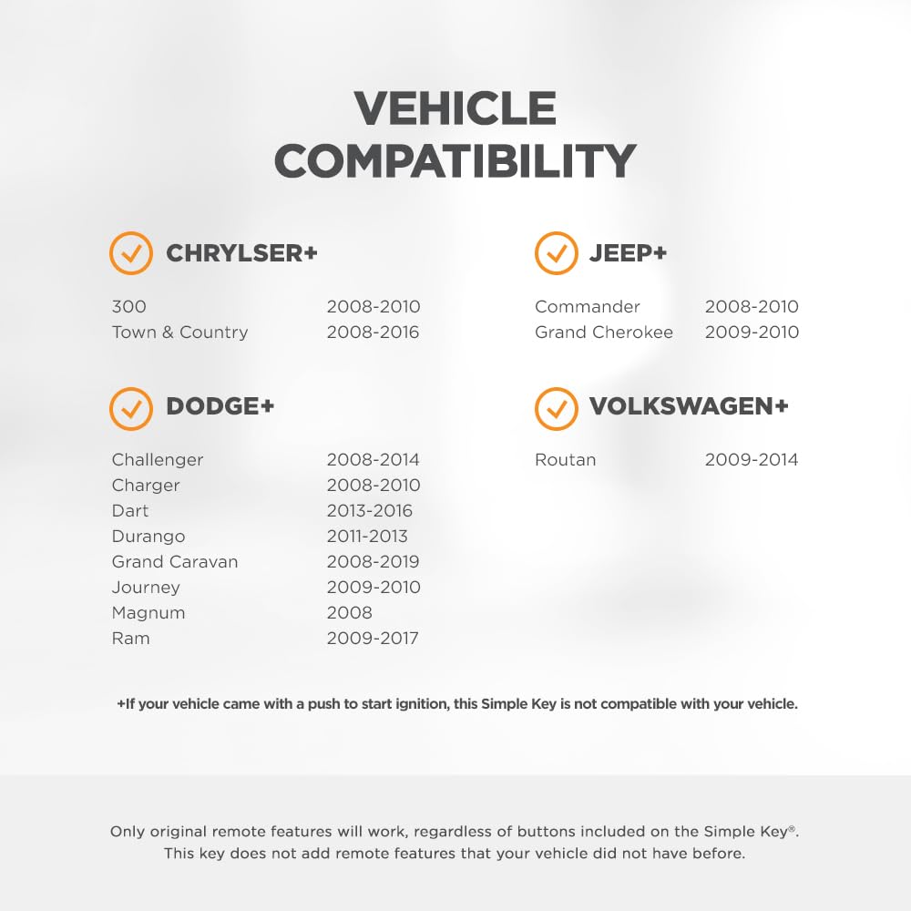 This Simple Key Programmer Makes ''Do-It-Yourself'' Car Key Programming Easy. This Kit Enables Easy Programing Of A New Key Fob For Many Chrysler, Dodge, Jeep And Volkswagen Vehicles. Easy To Follow Instructions Guide You Through Each Step Of The Process. Requires One Working Key That Starts Your Vehicle. Activate The Fob For Your Vehicle, Plug The Programmer Into Your Vehicle Obd Ii Port Located Above The Gas Pedal, And Within Minutes The New Fob Will Be Paired To Your Vehicle. Program Up To 8 Fobs For A Single Vehicle. No Risk - If It Does Not Work For Your Vehicle, Simply Return It For Your Full Money-Back Guarantee. Note - Only Original Remote Fob Functions Will Work - Programmer Can Not Add Functions That Did Not Come With Vehicle. Compatible With The Following Vehicles: Chrysler 300 2008-2010; Town & Country 2008-2016; Dodge Challenger 2008-2014; Charger 2008-2010; Dart 2013-2016; Durango 2011-2013; Grand Caravan 2008-2019; Journey 2009-2010; Magnum 2008; Ram Trucks 2009-2017 Including 1500, 2500, 3500, And More; Jeep Commander 2008-2010; Grand Cherokee 2009-2010; Volkswagen Routan 2009-2014.
